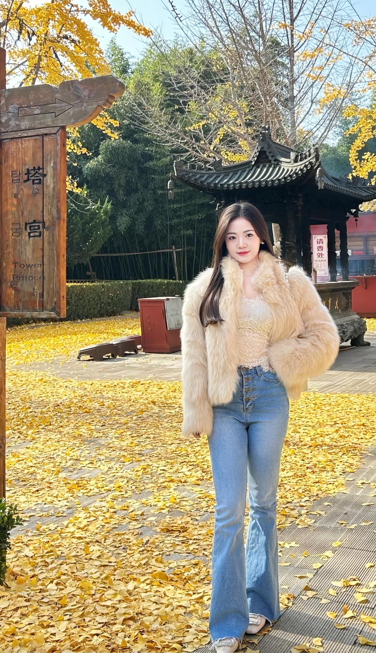 秋日暖阳下的塔宫,落叶铺满小径,少女漫步其中,美不胜收。