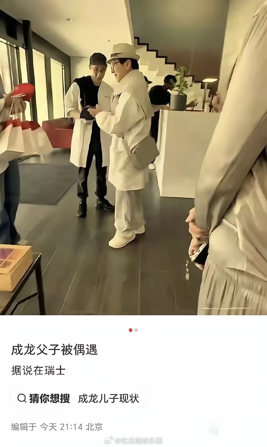 成龙与房祖名父子在瑞士被偶,二人都穿着白色的衣服,房祖名腿细得让人心疼,像生病了一样,跟麻杆似的。