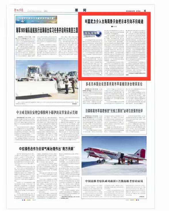 解放军报:日本若武力介入台海,全国都有沦为战场的风险 在解放军报最新一期的内容中