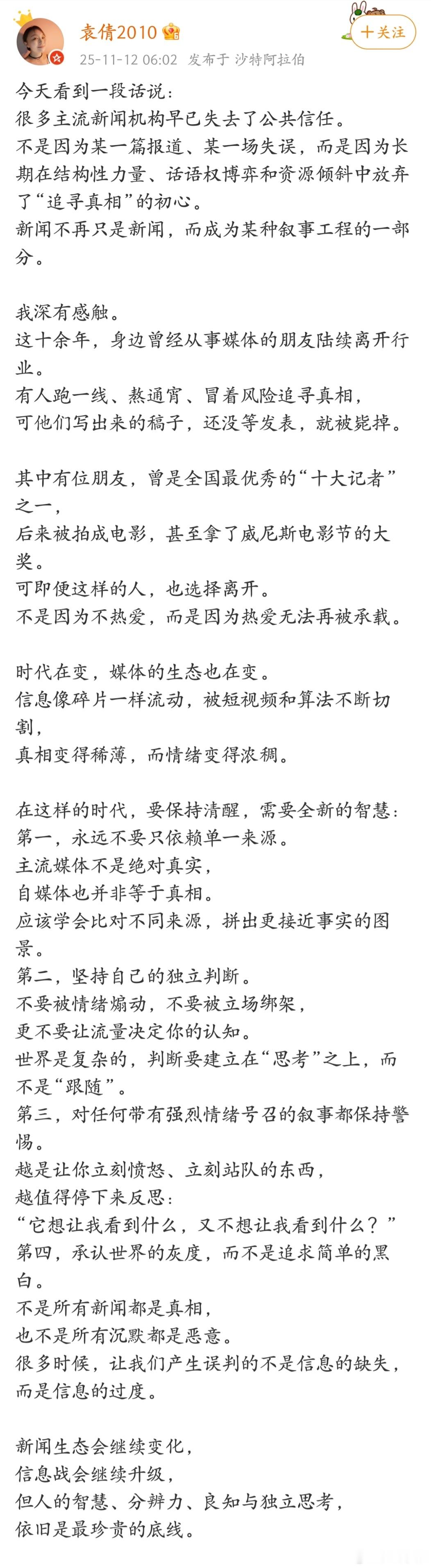 “很多主流新闻机构早已失去了公共信任。新闻不再只是新闻,而成为某种叙事工程的一部分。”