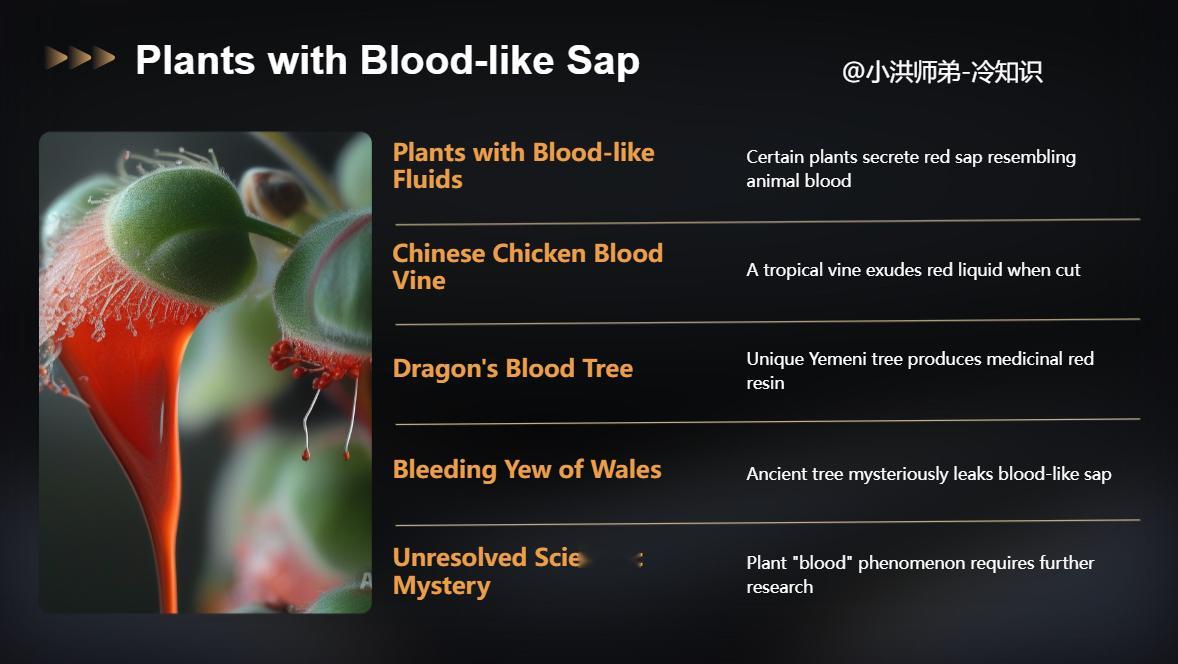 植物是否有血液人和动物都有血液,那么植物有血液吗?我国南方山林的灌木丛中,生长着一种常绿的藤状植物。每到夏季,便开出玫瑰色的美丽花朵。当你用刀子把藤割断时,就会发现,流出的液汁先是红棕色,然后慢慢变成鲜红色,与鸡血一样,这种植物叫“鸡血藤”。南也门的索科特拉岛,是世界上最奇异的地方。据统计,岛上约有200种植物是世界上任何地方都没有的。其中有一种“龙血树”,它分泌出一种像血液一样的红色树脂,这种树脂被广泛地用于医学和美容。这种树主要生长在这个岛的山区。英国威尔有一座公元6世纪建成的古建筑物,它的前院耸立着一株杉树,至今已有700年的历史。这株树高7米多,它有一种奇怪的现象,长年累月流着一种像血液一样的液体,这种液体是从这株树的一条2米多长的天然裂缝中流出来的,这种奇异的现象,每年都吸引着成千上万的游客。这颗杉树为什么会流“血”,引起了科学家的注意。他们对这颗树进行了深入研究,也没找到流“血”的原因。要想揭开其中的奥秘我们只有等待着科学家们继续去努力探索。关于植物是否有血液的问题也待进一步研究。|||