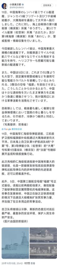 日本防卫大臣小泉进次郎11月13日晚写道:“11日,中国海军的仁海级导弹驱逐舰、江凯Ⅱ级护卫舰以及福池级补给舰,穿越大隅海峡驶向太平洋。对此,海上自卫队第11护卫队(横须贺基地)的‘夕雾’号、第3导弹艇队(佐世保基地)的‘大鹰’号以及第1扫雷队(横须贺基地)的‘淡路’号,实施了警戒监视与情报收集任务。 大隅海峡这地方,本来就是个国际水道,中国海军穿过去完全符合国际法,日本自己也知道这一点,所以只能派船跟着看看,不敢有啥大动作。 但日本防卫大臣专门发文强调这事儿,还特意点出仁海级驱逐舰的厉害之处,明显是想给国内和国际传递个信号——中国海军越来越强了,日本得提高警惕。 这种做法其实挺矛盾的,一方面日本嘴上说欢迎中国发展,另一方面又总拿中国海军的正常训练说事儿,心里的小九九谁都看得出来。 中国海军这几年发展确实快,以前咱们连像样的驱逐舰都造不出来,现在仁海级这种万吨大驱都成批服役了,日本心里能不慌吗?以前日本海上自卫队在亚洲可是数一数二的,现在中国海军不光舰艇数量上来了,质量也突飞猛进,什么反舰弹道导弹、巡航导弹,这些先进武器日本自己都未必能全搞定。 中国海军现在不光在近海活动,动不动就穿个海峡去太平洋转一圈,这种远洋能力日本看了肯定眼红。 日本防卫大臣小泉进次郎这个人也挺有意思,他是前首相小泉纯一郎的儿子,政治世家出身,说话做事总带着点表演性质。 这次发文特意强调中国海军的舰艇性能,其实是在给自己刷存在感,向国内展示自己“重视国防”的形象。 日本现在国内经济不景气,民众对政府意见挺大,小泉进次郎想通过渲染“中国威胁”来转移注意力,这种政治手腕在西方政客里挺常见的。 中国海军这次穿越大隅海峡,其实也不是第一次了,近几年中国海军舰艇编队经常通过日本周边海峡进入太平洋,这已经成为常态化操作。 以前中国海军实力不行,只能在近海转悠,现在不一样了,航母有了,万吨大驱有了,远洋补给舰也有了,自然要走出去看看。 太平洋那么大,中国海军总不能一直待在家里吧?日本作为邻国,看着中国海军越来越强大,心里肯定不是滋味,但这也是没办法的事,谁让中国发展这么快呢。 日本海上自卫队这次派出的舰艇也挺有意思,“夕雾”号护卫舰是上世纪80年代的老船了,“大鹰”号导弹艇吨位小,远洋能力有限,“淡路”号扫雷舰更是没啥战斗力。 日本派这种级别的舰艇去监视中国海军的新锐战舰,明显是力不从心。这也能看出日本海上自卫队的尴尬,一方面想展示自己的存在感,另一方面实力又跟不上,只能派些老船去凑数。 中国海军这次编队中的福池级补给舰也值得注意,这种大型补给舰是远洋训练的关键,没有它,舰艇编队根本走不远。 中国海军现在能常态化进行远洋训练,说明后勤保障能力已经上了一个大台阶。日本以前在这方面挺有优势的,现在中国也追上来了,而且规模更大,日本看着肯定不是滋味。 大隅海峡这地方地理位置挺重要的,连接着东海和太平洋,中国海军要进入太平洋,这条海峡是必经之路之一。 日本其实也明白,中国海军穿过去是合理合法的,所以每次只能派船跟着看看,不敢有啥过激举动。但日本媒体每次都会大肆报道,把中国海军说成是“威胁”,这种舆论操作其实挺没意思的。 中国海军现在的发展势头确实猛,不光是舰艇数量增加,质量也在不断提升。仁海级驱逐舰的服役,标志着中国海军已经具备了世界一流的远洋作战能力。日本海上自卫队以前在亚洲可是老大,现在中国海军在很多方面已经超过日本了,这种心理落差日本肯定不好受。 小泉进次郎这次发文,其实也是在向美国表忠心。日本现在跟美国走得很近,经常配合美国的“印太战略”来遏制中国。日本防卫大臣特意强调中国海军的动向,其实是在告诉美国:“你看,我很重视中国威胁,我正在努力监视中国海军。”这种做法挺可悲的,日本作为亚洲大国,却甘当美国的马前卒,来对付自己的邻国。 中国海军穿越大隅海峡,其实也是在向外界展示自己的实力。以前中国海军弱小,别人都不把咱们当回事,现在中国海军强大了,自然要让别人知道咱们的存在。这种军事力量的展示,其实也是一种外交手段,让其他国家不敢小看中国。
