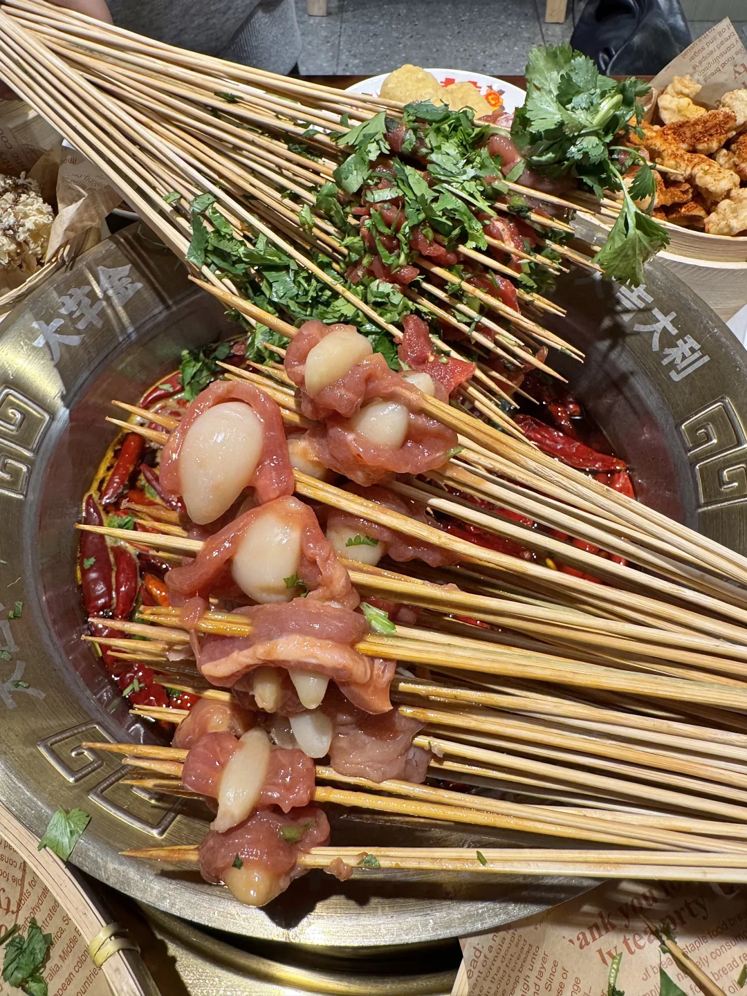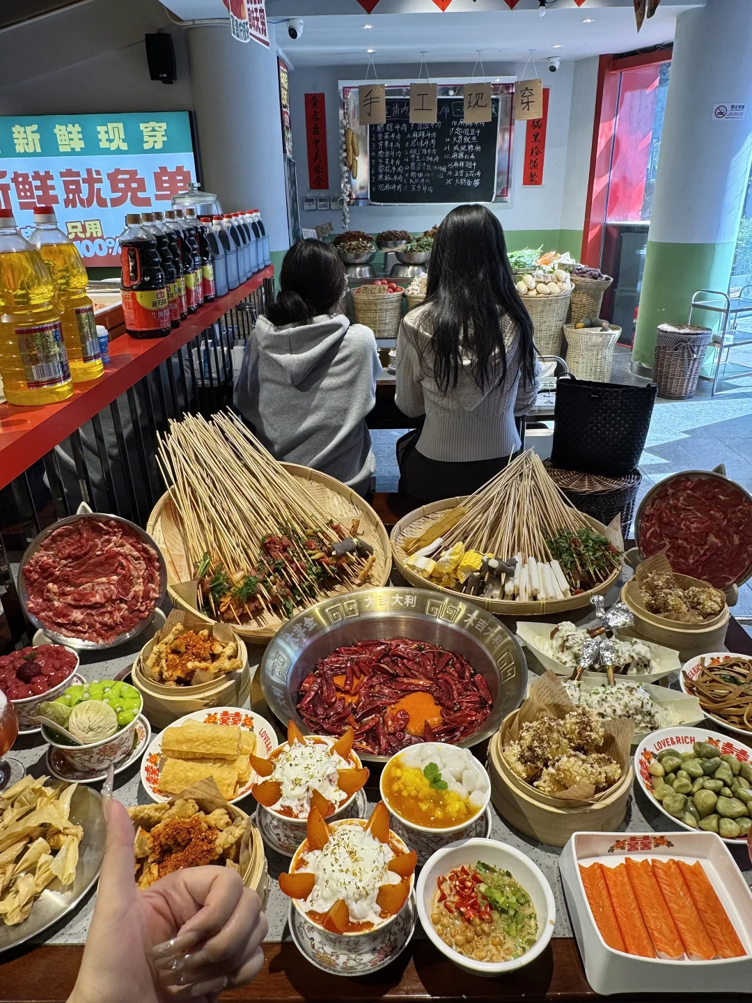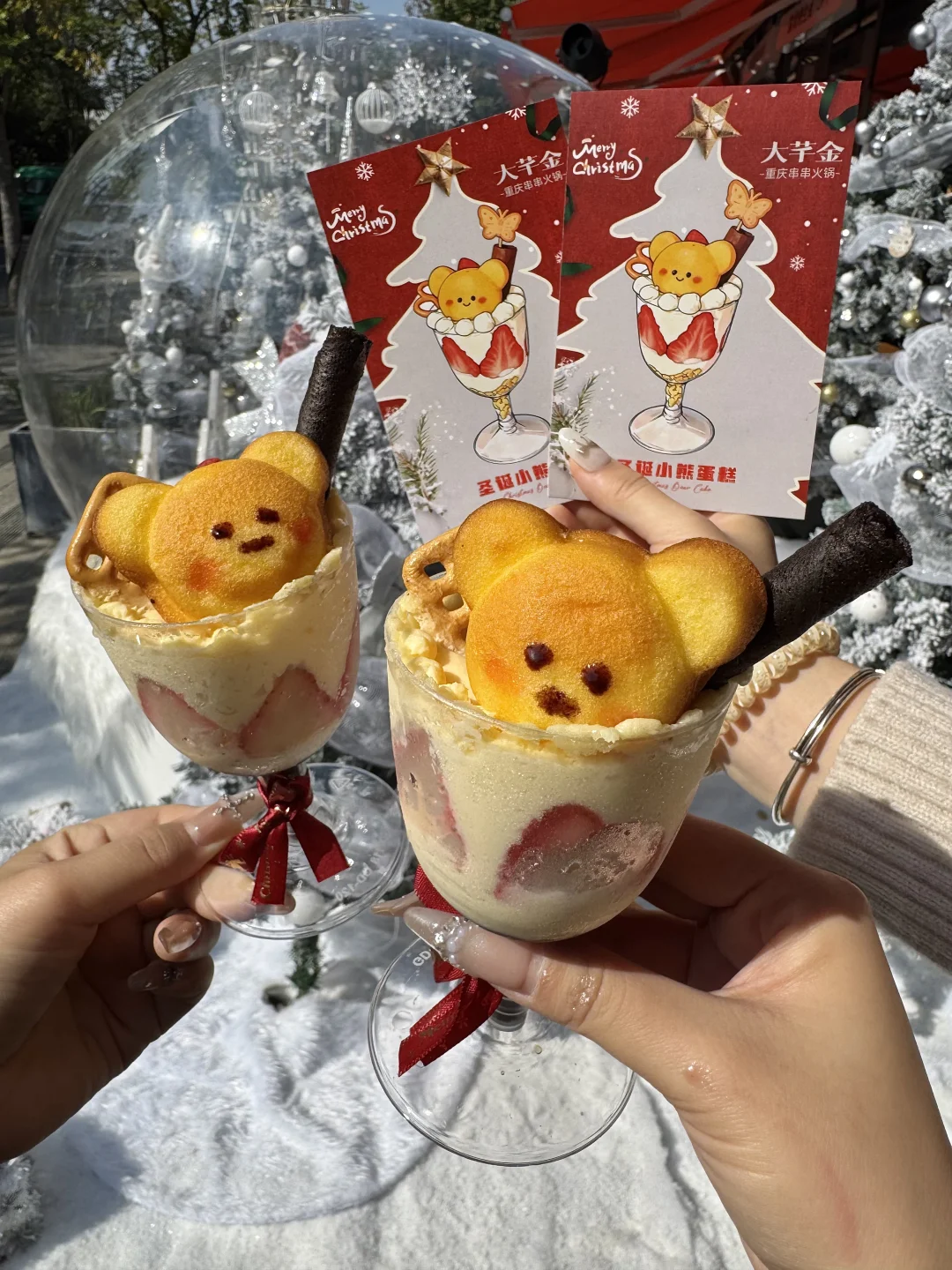 圣诞🎄氛围好足 ~他家的牛肉串串好新鲜,锅底嘎嘎香!!香菜牛肉、糖蒜牛肉香s了😭😭 雪顶草莓气泡、调色盘鸡翅、流心柿子冰、青椒美乃滋大鸡腿…嘎嘎好吃!!