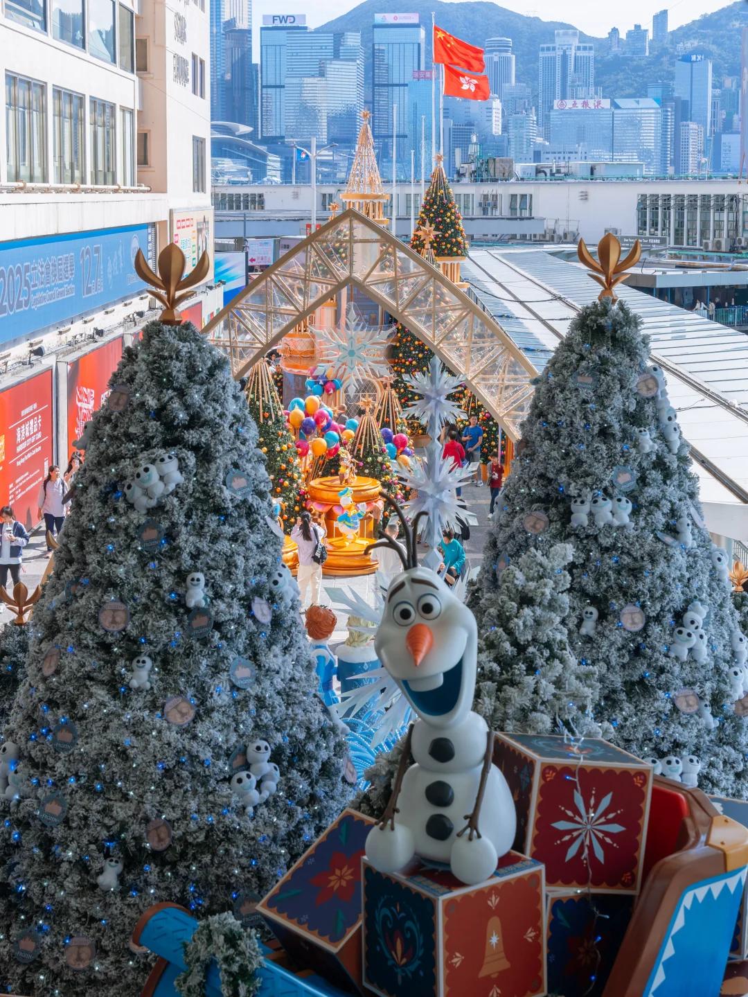 港铁尖沙咀L6出口,迪士尼联名圣诞树,冰雪奇缘、米老鼠与唐老鸭,全面开放了,白天和晚上都非常出片。