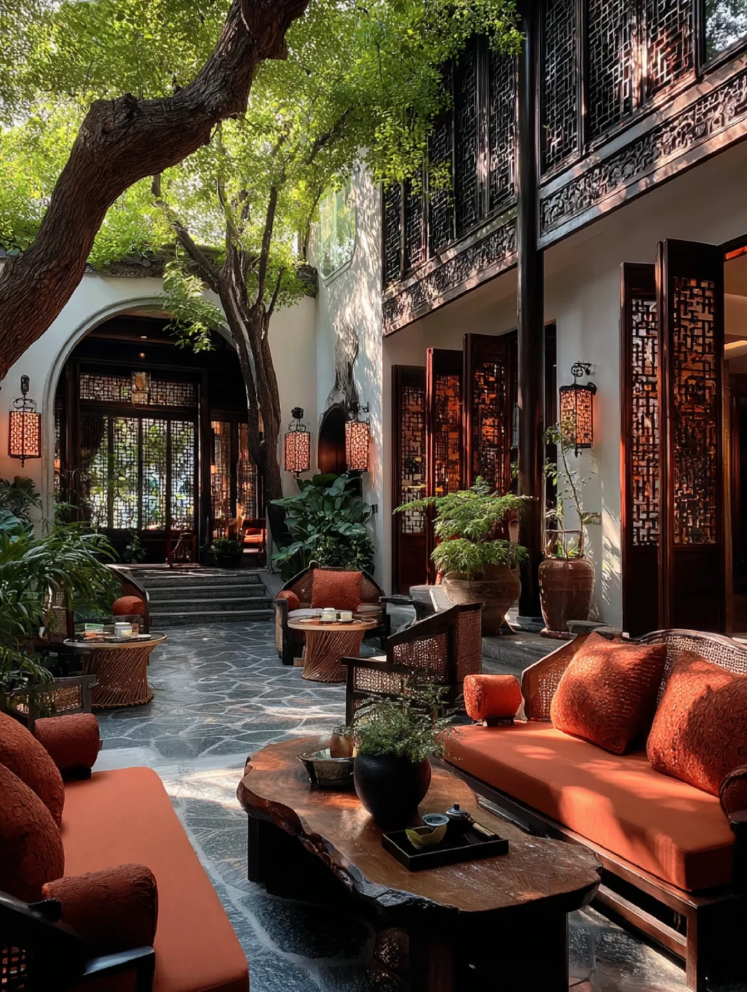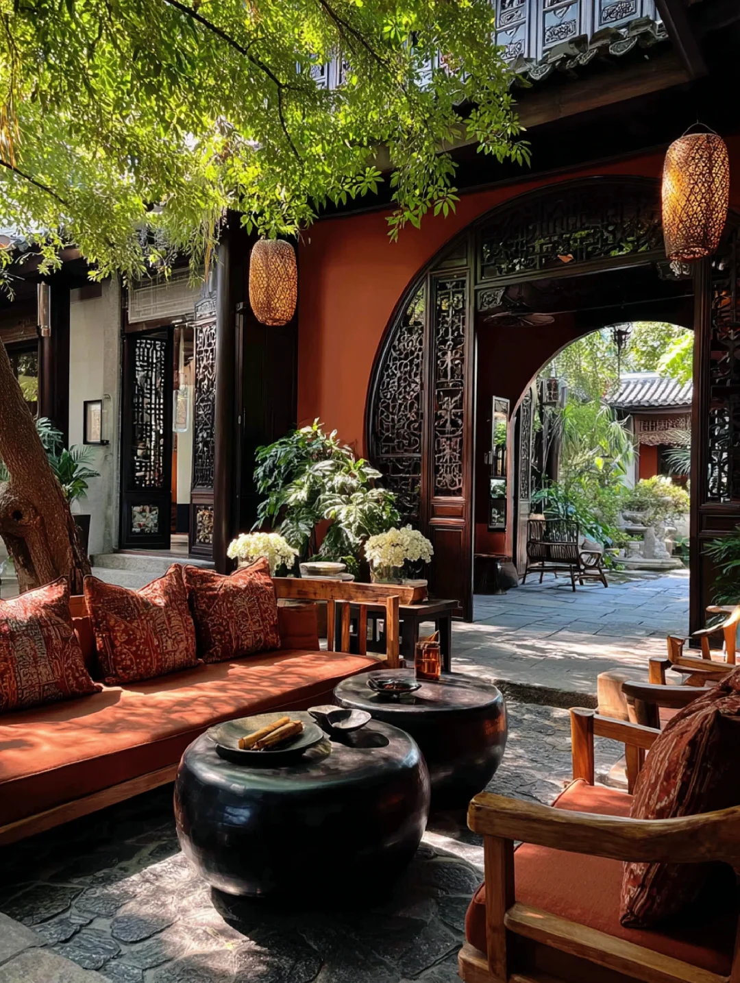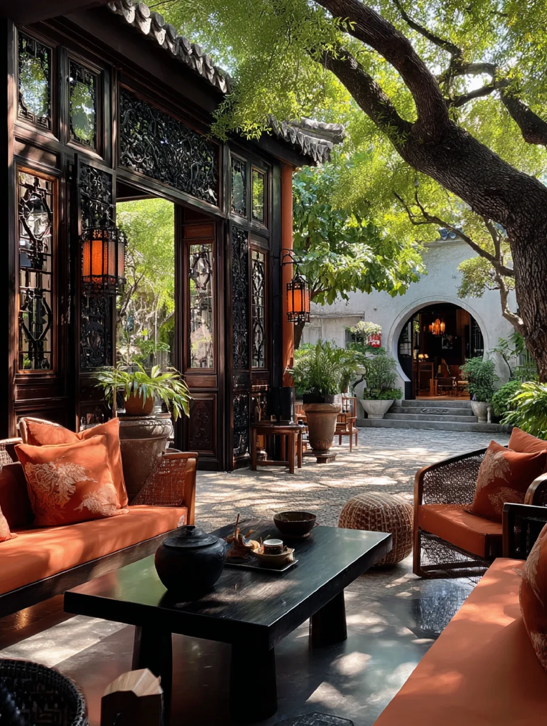 中式庭院从不堆砌奢华, 而是用最质朴的元素,勾勒出天地至美 几株老树倚墙,守着四季轮回; 连漏窗外的那抹斜阳, 都成了诗人笔下最温柔的注脚。 【作品为ai辅助创作】