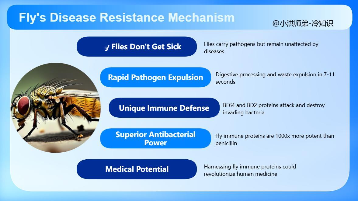 苍蝇为什么不会生病苍蝇是臭名昭著的“逐臭之夫”,垃圾堆、腐烂的动物尸体都会引来成群结队的苍蝇。苍蝇到处传播疾病,对人类危害极大。令人奇怪的是,苍蝇全身都带着病菌,而自己却从不被病菌所感染,从生到死都不会害病,其中的奥秘在哪里呢?许多生物学家、病理学家对苍蝇进行研究后发现,苍蝇对付疾病,有独特的本领。它吃了带有多种病菌的食物后,能在消化道内进行快速处理,把无用的废物和病菌很快排出体外。苍蝇从进食处理、吸收养分一直到将废物排出体外,一般只需要7~11秒钟,细菌进入苍蝇体内后没等繁殖子孙就已被苍蝇排出了体外。如此高速度、高效率的处理方法,是其他动物望尘莫及的。一般的哺乳动物从进食到排便,最快的也要几十分钟,有的要几个小时;而人类在正常情况下,是24小时排便1次,所以当人们吃了带有病菌的不洁食物后,一旦不能把病菌及毒素迅速排出体外,病菌就会在体内“兴风作浪”,给人体造成危害。虽然苍蝇有快速排出病菌的本事,但有些细菌也有快速繁殖的能力。遇上这些对手时,病菌就会在苍蝇体内大肆活动。不过,苍蝇也有对付的办法,那就是在不得已的情况下,动用自己体内的“原子弹”和“氢弹”。意大利科学家莱维蒙尔尼卡博士经过研究发现,当病菌侵犯苍蝇机体时,苍蝇的免疫系统就会“发射”BF64、BD2两种球蛋白。这两种球蛋白就像人类使用的“原子弹”、“氢弹”一样,射向病菌并爆炸,与“敌人”同归于尽。有趣的是BF64、BD2球蛋白从免疫系统“发射”出来时,总是一前一后,成双成对,从不错乱,而且“发射”快,“制造”也快,很快就能将“敌人”消灭。值得指出的是,BF64、BD2的杀菌力要比青霉素强千百倍。如果能提取苍蝇体内的BF64、BD2用于人类治病,那将给病人带来福音。|||