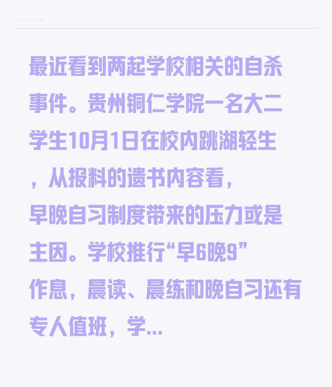 最近看到两起学校相关的自杀事件。贵州铜仁学院一名大二学生10月1日在校内跳湖轻生,从报料的遗书内容看,早晚自习制度带来的压力或是主因。学校推行“早6晚9”作息,晨读、晨练和晚自习还有专人值班,学生压力可想而知。 浙江金华武义县武阳中学一名25岁女教师也在10月11日自杀。网传她因新工作压力大患焦虑症和抑郁症,请假未获批才轻生,但校方称已给假。 这些悲剧太让人痛心,学校真该多关注师生心理健康,别让压力成为生命不可承受之重。