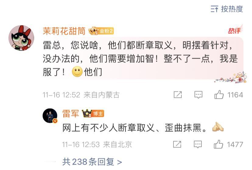 雷军:网上有不少人断章取义,歪曲抹黑! 今天雷军一改往常的分享,对于网上的一些传闻进行了辟谣,特别是有些人对雷军的讲话进行了曲解或断章取义。 其实大家刷短视频的时候是最容易刷到的,因为这些人往往不播放完整的画面,将很多个讲话拼凑到一起,就显得特别的不同。 各位是怎么看的?欢迎评论区留言。