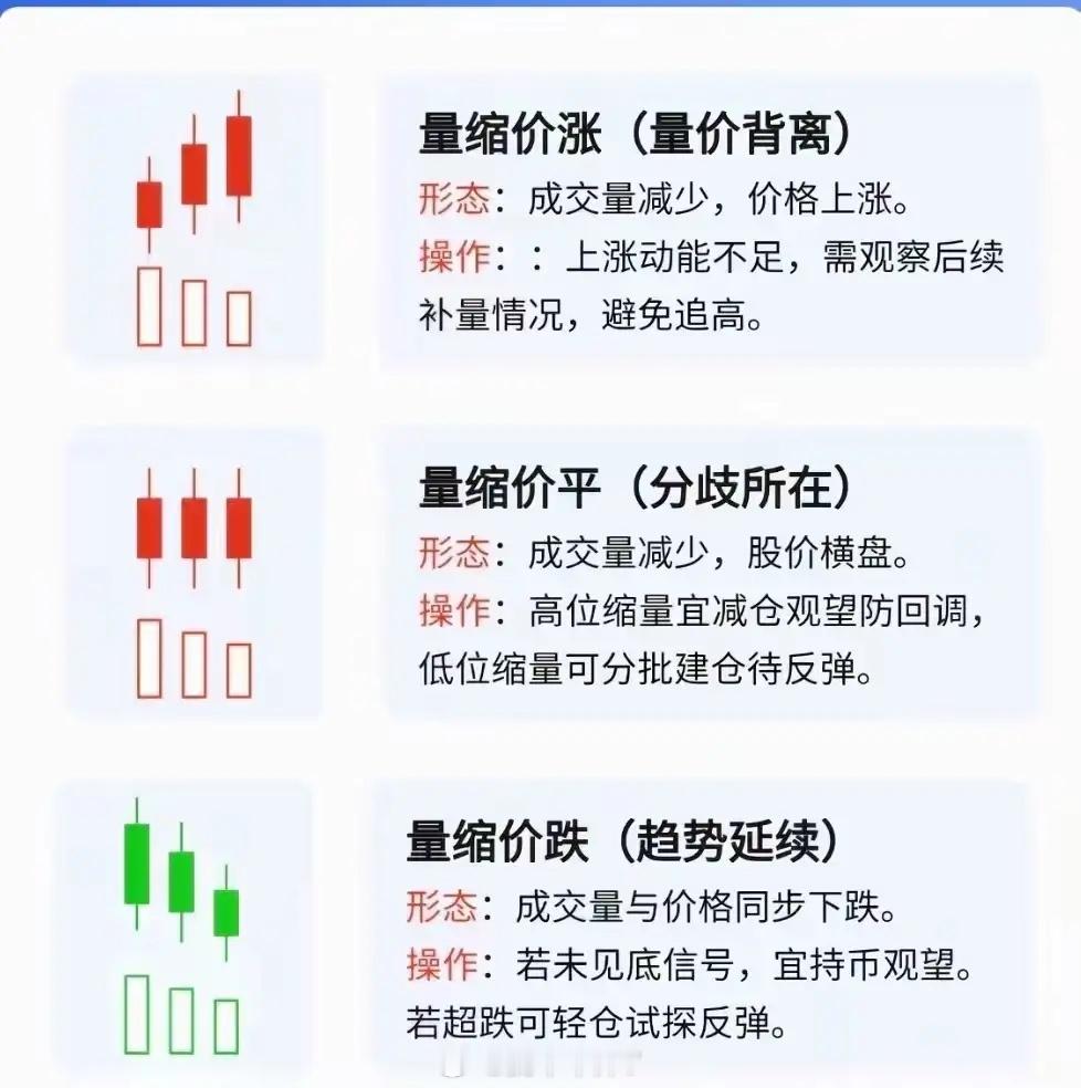 "八句量价实战口诀"(收藏学习)【量价核心八诀】1. 无量攀升续涨势(缩量上涨还将涨)——成交量递减但价格坚挺,说明筹码锁定良好,上涨动能未竭2. 无量阴跌慎抄底(缩量下跌还将跌)——下跌无量显示抛压绵长,空头趋势尚未释放完毕3. 巨量上攻需警惕(放量上涨必回落)——爆量拉升往往伴随短期过热,需防范获利盘集中兑现4. 放量急挫莫慌张(放量下跌不着急)——恐慌性放量下跌常现阶段性低点,待缩量企稳可关注5. 地量横盘见真底(缩量不跌筑底成)——持续地量伴随价格平稳,主力吸筹完毕的筑底信号6. 天量滞涨顶部显(放量不涨头部现)——历史天量却无法推升股价,主力出货概率极高7. 天量见天价常理(量大成头量小底)——头部往往伴随异常巨量,而底部多现温和缩量8. 无量暴跌后劲强(无量顶跌后市强)——无量快速杀跌后易现报复性反弹,因做空动能短期衰竭