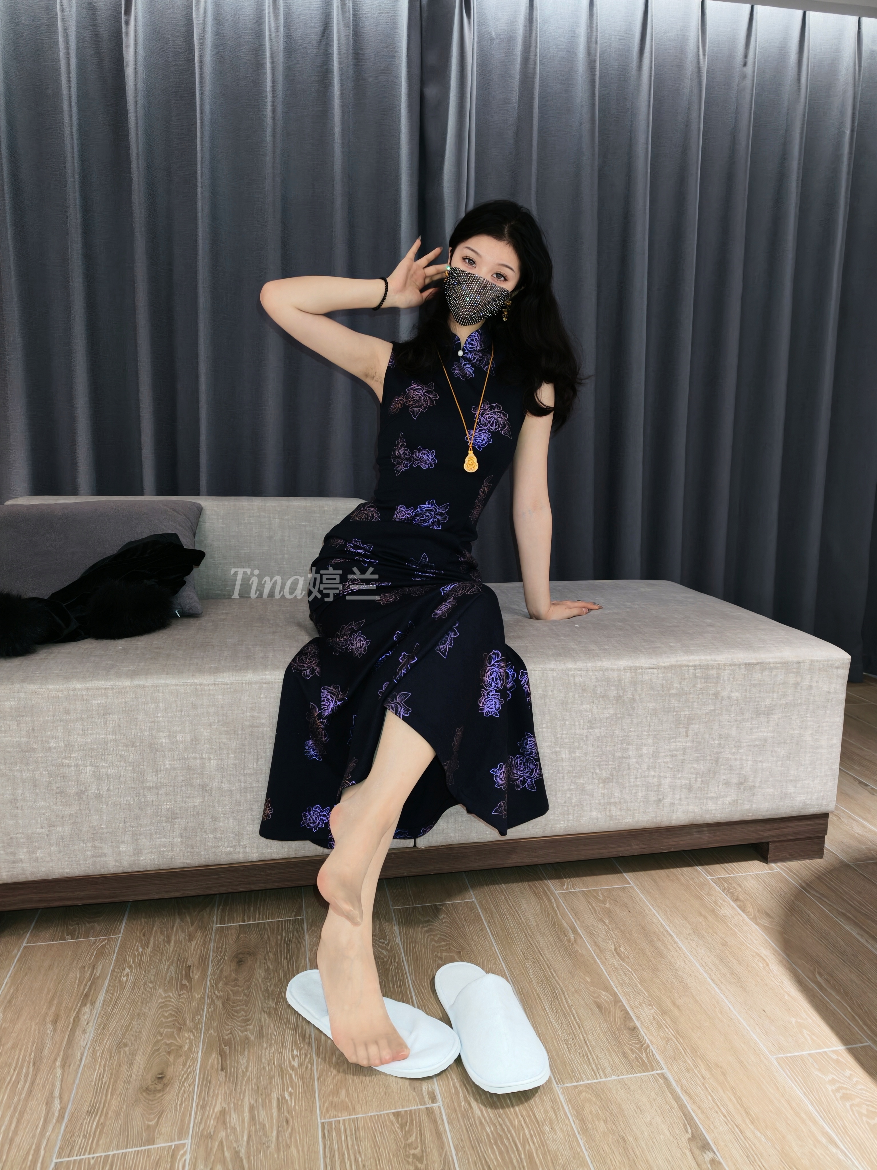 出差收拾衣服没注意看,以为带的是肉丝,没想到是条灰色的菱格,好在和我这条旗袍还能