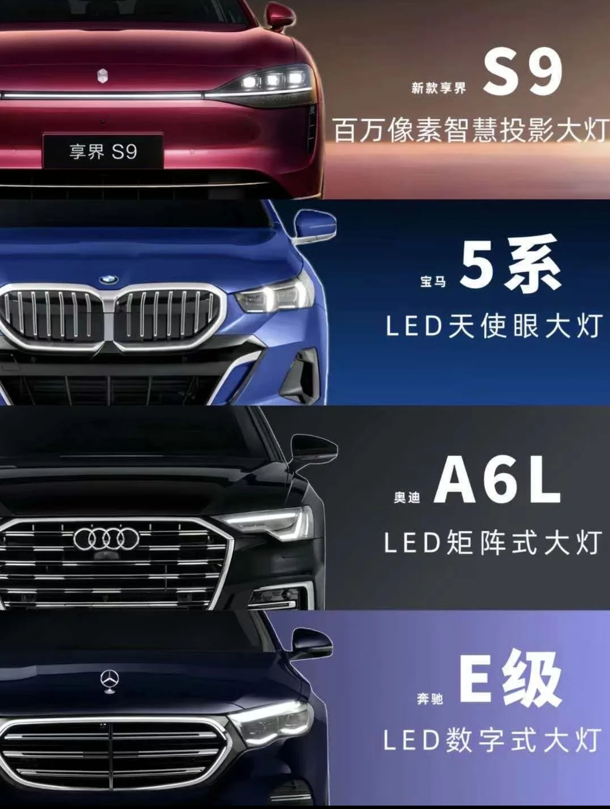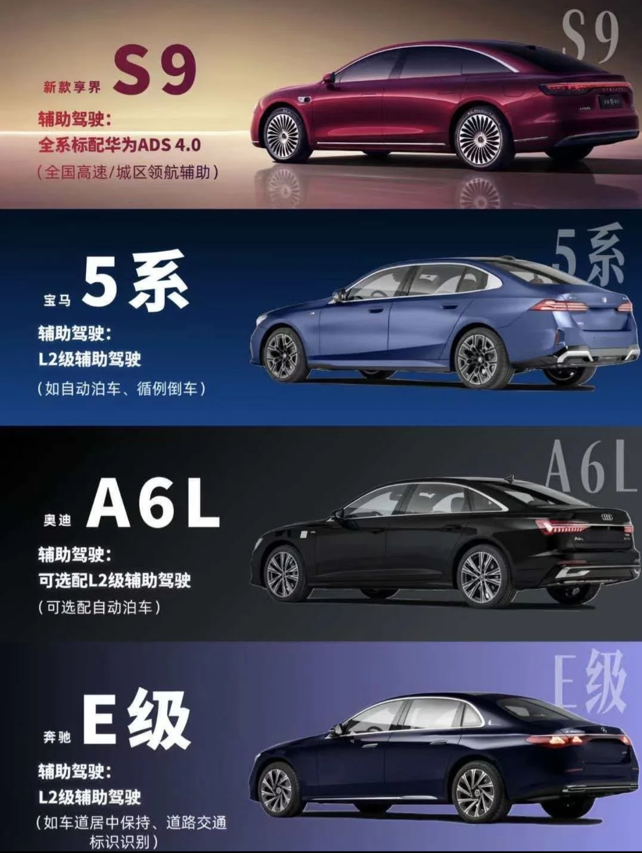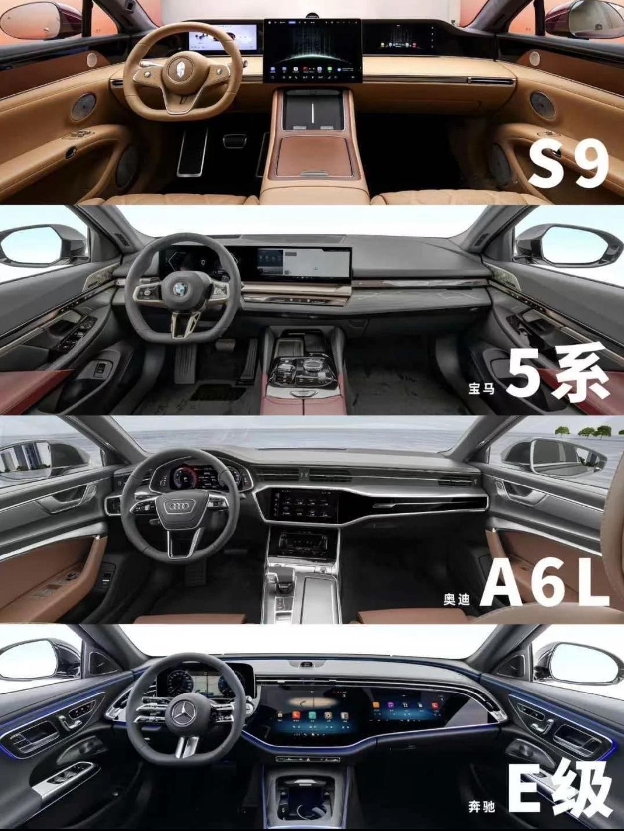 享界S9、宝马5系、奥迪A6L、奔驰E级,谁最强?享界S9综合实力绝对是遥遥领先的。如果仅看设计,外观:享界S9第一,奔驰E级第二,宝马5系第三,奥迪A6L第四。内饰:享界S9第一,宝马5系第二,奔驰E级第三,奥迪A6L第四。如果享界知名度和BBA一样高,S9销量立马就是同级第一名,信不信?