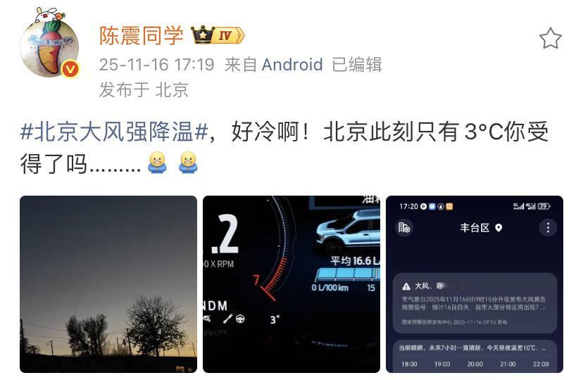 陈震:好冷呀,北京此刻只有3℃! 从今天开始,大部分地区也都会陆续加入降温的行列,有的地区今天还是非常温暖的,但是到明天气温就会骤降到只有0℃。 在这种季节里还是要多穿衣服,谨防感冒。各位是怎么看的?欢迎评论区留言。