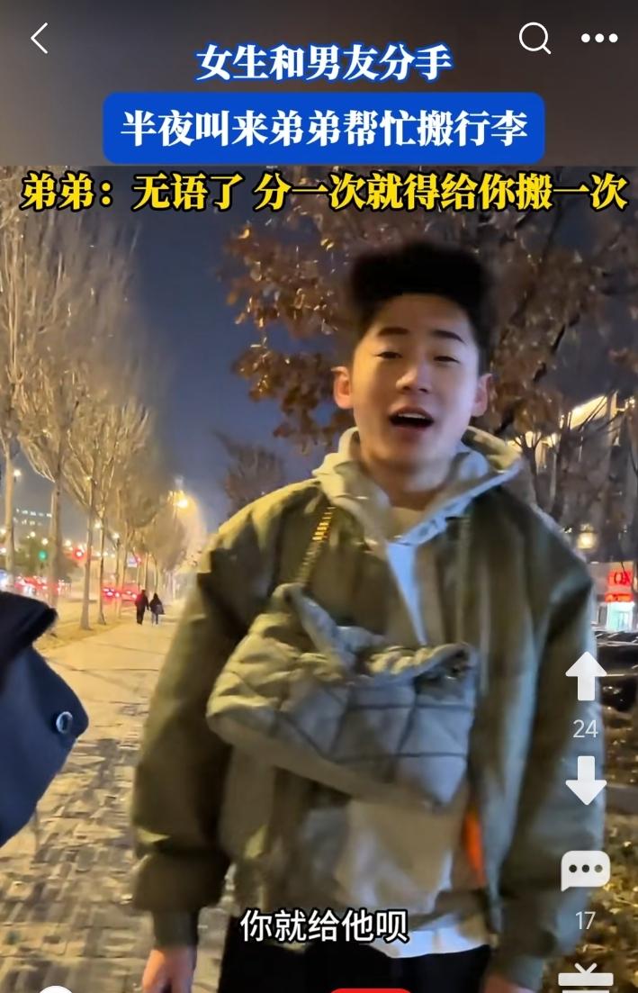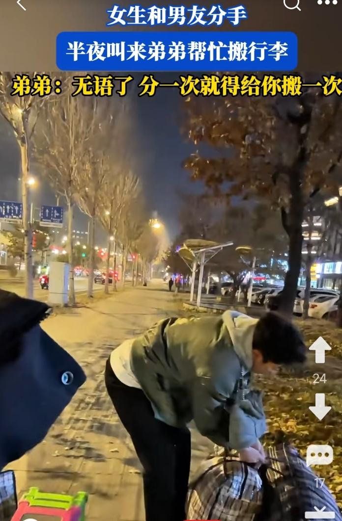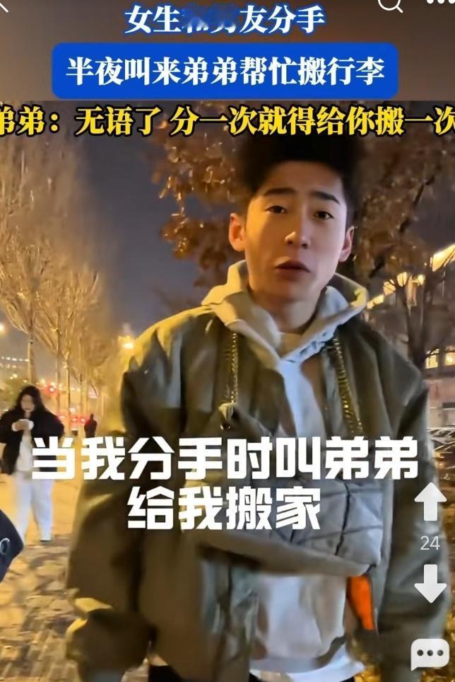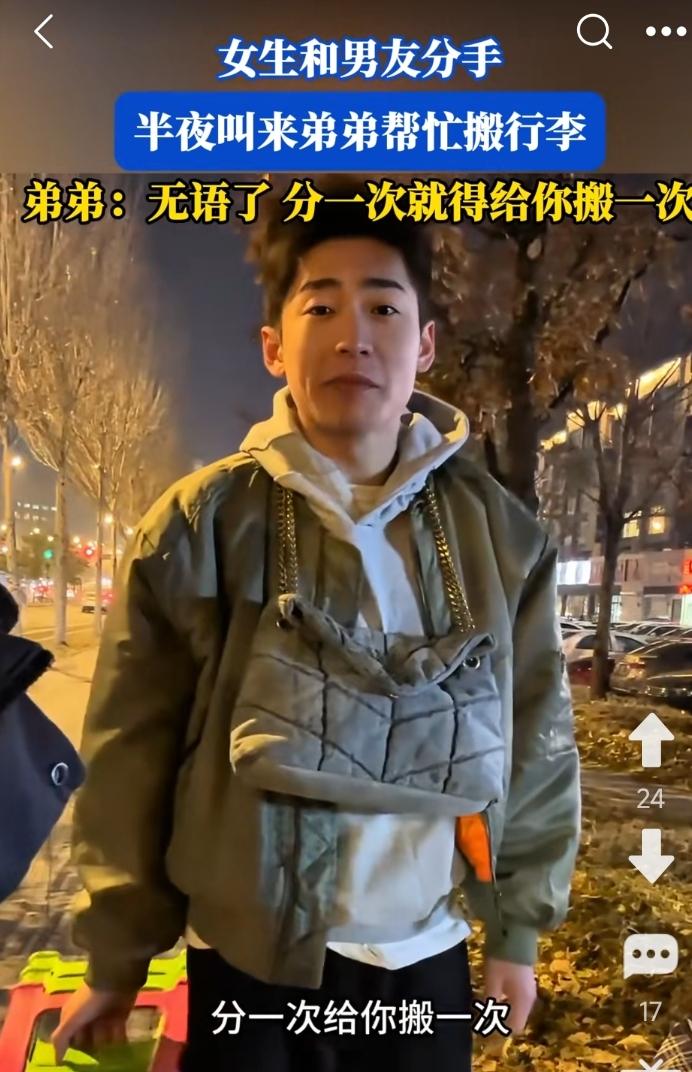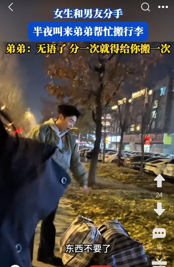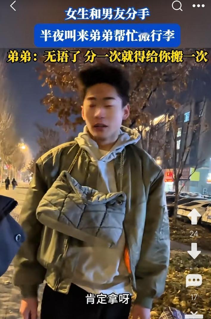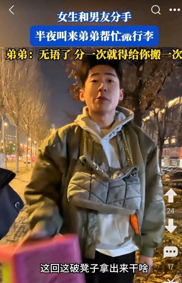 这个老弟也是够冤的,姐分手一次,不管住得有多远,都叫弟来搬行李一次。 行李还一大堆的。 连张破凳都不留,更不用说锅碗瓢盆了。 姐还说,是我的东西,一点都不能便宜了他。 问题是,她已经分手好几回了。 不知道她以后还要分手多少回。 唉,这样的姐,老弟有操不尽的心。