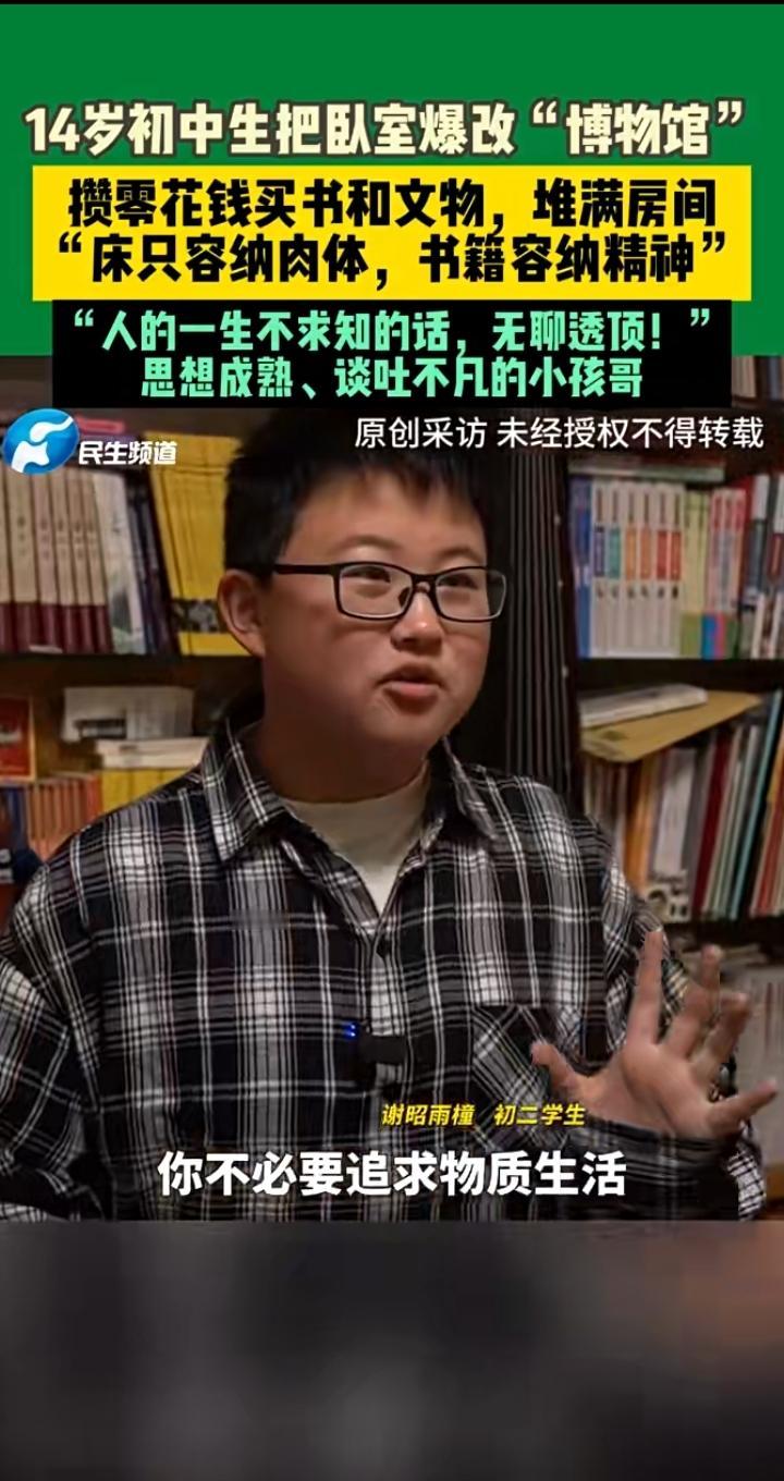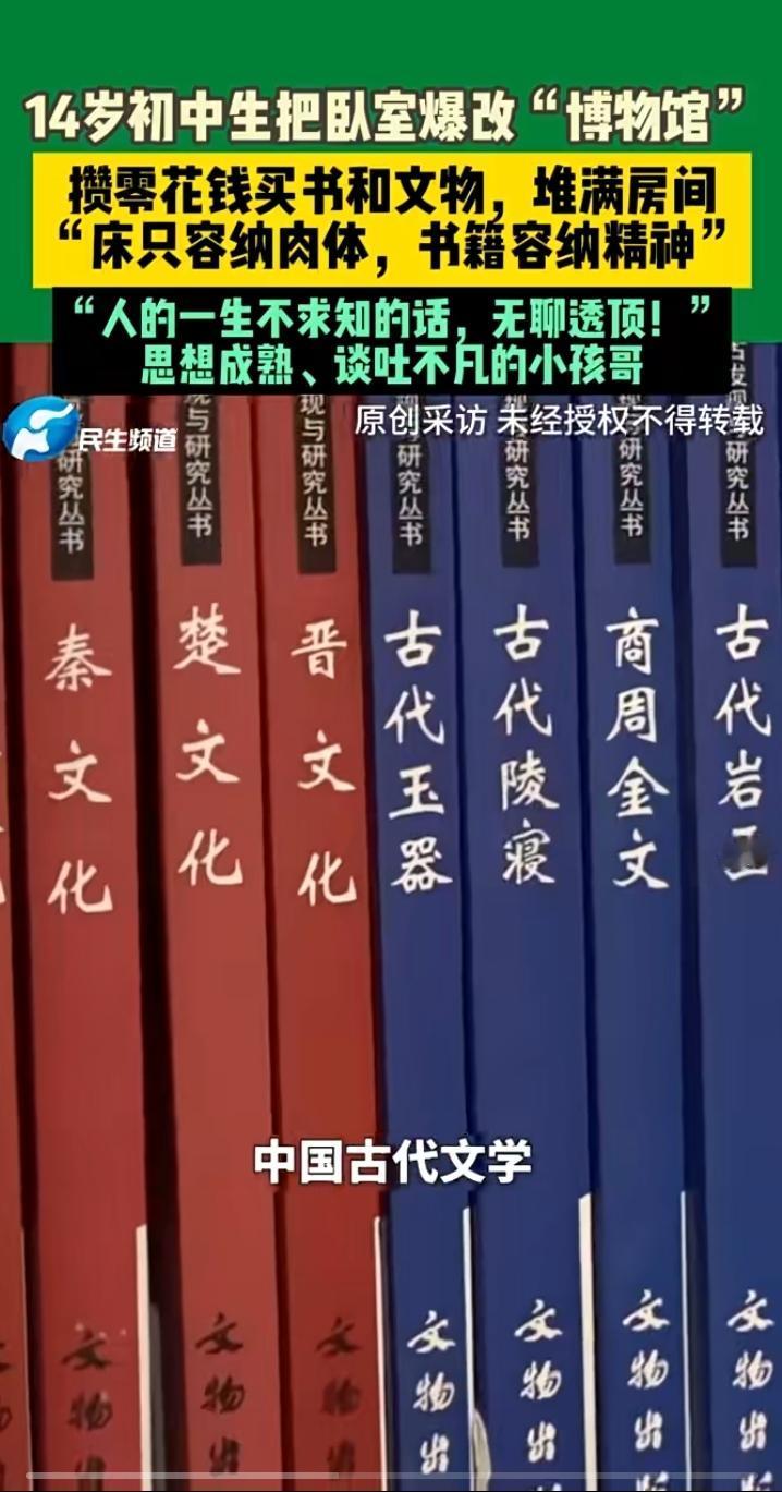 14岁少年用“博物馆”点亮人生:用心收藏的,是对文化的热爱与坚持 近日,河南郑州一位14岁初中生将自己的卧室变成了私人“博物馆”,珍藏了利用零花钱买来的元代高足杯、洛阳汉砖等。房间堆满书籍与文物,只有床上是空闲的。在他看来,“床只容纳肉体,书籍容纳精神”。 这位年仅14岁的少年,用他的行动告诉我们:真正的成长,不仅仅是学习成绩的提升,更是内心世界的丰富与品味的升华。在这个浮躁的时代,多少人沉迷于虚拟的娱乐,迷失在快节奏的生活中,而他,却用一间“博物馆”般的房间,诠释了对文化的热爱与坚持。 或许有人会觉得,这样的“收藏”有些另类,甚至有些“怪异”。但换个角度来看,他用自己的方式,诠释了对历史、对文化的敬畏。那一只只古老的元代高足杯、洛阳汉砖,不仅仅是文物,更是时间的见证,是先辈智慧的结晶。而他用零花钱一点点积累,用心呵护这些“宝贝”,比起那些盲目追求潮流的同龄人,他的眼界和格局,似乎更为宽广。 更令人动容的是,他的“房间哲学”:床只容纳肉体,书籍容纳精神。这句话,简直就是一份对生命的深刻理解。在这个快餐式的社会里,多少人迷失在表面的繁华,却忘记了灵魂的充实。这个少年用自己的行动告诉我们:真正的幸福,不在于物质的堆砌,而在于精神的富足。书籍、文物,是他精神的食粮,也是他对未来的投资。 这个故事,折射出一个深刻的社会现象:我们是否还在用心去发现生活中的美好?是否还在用行动去追求自己真正热爱的事物?在这个“快餐文化”盛行的时代,少年的坚持无疑是一股清流。他用自己的方式,向我们传递了一种积极向上的生活态度:热爱、坚持、用心。 或许,他的“博物馆”还只是个起点,但它代表的意义远远超出空间的局限。它告诉我们:每个人都可以成为自己生活的“收藏家”,用心去珍藏那些有温度、有故事的东西。也许,我们每个人都应该像他一样,把生活变成一场充满意义的“收藏之旅”,用心去感受、去珍惜。 这个14岁的少年,用他的行动激励我们:无论年龄多大,只要心中有热爱,就能创造出属于自己的精彩。也许,我们都该问问自己:在这个快节奏的社会里,我们是否也能像他一样,静下心来,去发现那些被忽略的美好?因为,真正的成长,正是在那些看似普通,却充满温度的细节中悄然发生的。带娃来博物馆 带娃探秘博物馆