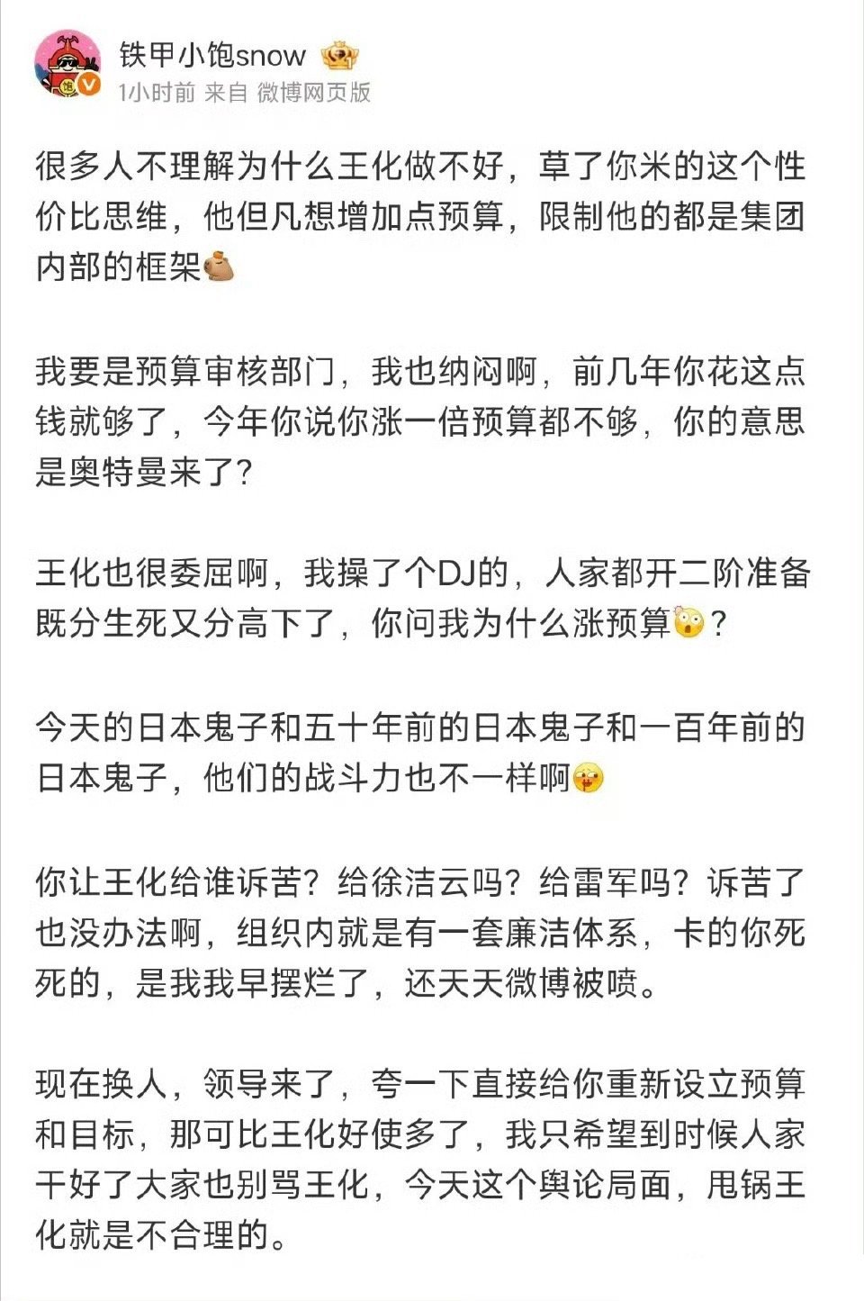 性价比营销的必然结果,会花钱很重要,省钱过不好日子。希望两年之后雷总复盘,能看到王化的无奈,作为组织调整中被牺牲掉的东西,总有一天会以另外一种形式补偿王化,打工不易,王化继续努力吧。
