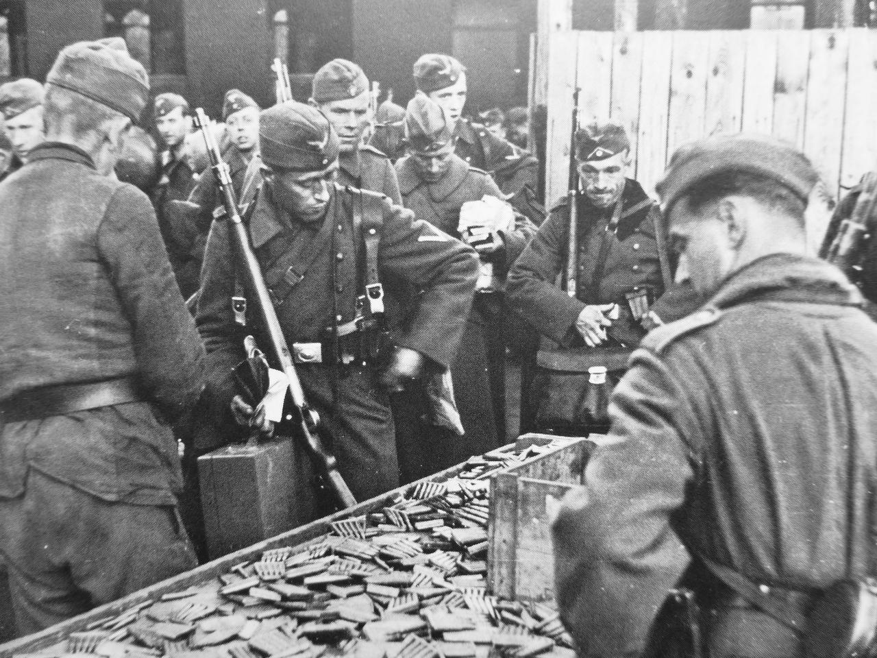 还以为是领子弹,原来是上交弹药——1942年,东线,白俄罗斯,戈梅利市火车站。一队德军士兵在出发返乡休假前,正按规定上缴个人弹药。 戈梅利市是白俄罗斯东南部战略交通枢纽,1941年8月被德军占领后成为中央集团军群重要后勤基地。 [呲牙] 那么,现在问题来了——请问画面中德军士兵携带的步枪型号(参见图2)?