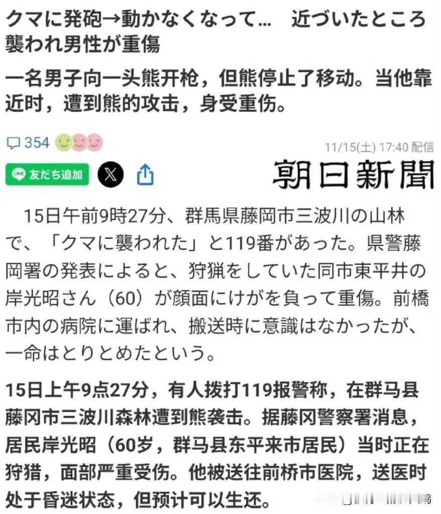 据朝日新闻报道称,11月15日,在群马县六名日本人围猎黑熊,猎枪射击后熊倒地装死,待人靠近后突然发动袭击,造成一人重伤后成功逃逸。 看完这则新闻,要不就是熊熊聪明,要不就是日本人笨。日本的熊熊现在饿急眼了都开始吃上日本人了…… 此前的新闻更过分,日本政府要求抓熊志愿者不可以使用猎枪,且劳务费仅为3000日元…… 你看看看,就算台湾没事,日本也是会有事的。🐰还没动手呢,🐻已经下嘴开吃🇯🇵人了,放🇯🇵历史文化里,这算是“天罚”了吧。