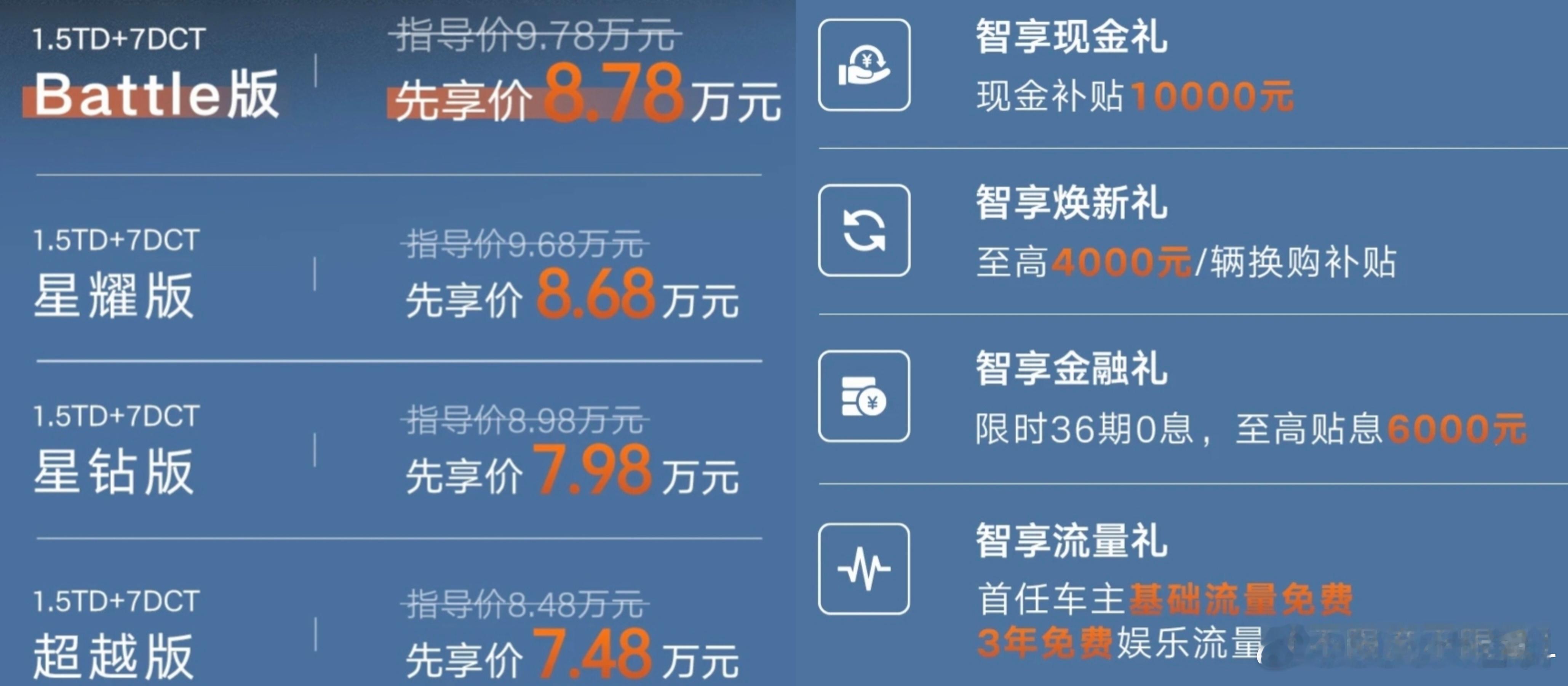 版昨晚上市,先享价8.78万元,购车权益包括36期0息/至高贴息6000元、至高4000元换购补贴、限时现金补贴10000元作为顶配版本,新车外观搭载了碳纤维风格运动套件,包括专属Battle标识、运动双峰大尾翼、红色卡钳、18英寸铝合金轮圈、尾部扩散器和领航雾灯内饰新增麂皮环抱式竞速座舱和豪华麂皮双拼座椅,辅以碳纤维风格饰板、竞速光轨氛围灯、橙色运动安全带点缀配置包括14.6英寸Flyme Auto智能座舱、自动空调、后排出风口、全景天窗、主驾6向电调、无钥匙进入、540°全景影像、L2智驾、倒车雷达等动力搭载1.5TD+7DCT黄金组合,配合四种驾驶模式,7.6s破百,起步响应仅需0.23秒,兼顾6.35L/100km油耗