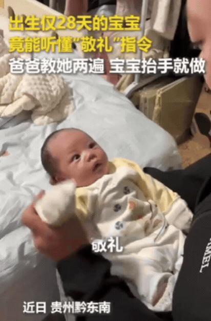 解释不清了!贵州一出生仅28天宝宝,听到爸爸喊“敬礼”时,竟然听懂了“敬礼"指令,抬手就做了个标准的敬礼,在此之前,宝宝没见过敬礼,而爸爸也只教了她2遍而已,这一幕让家人都吃惊不已!网友调侃:见过军训一个月的,第一次见一个月军训的! 贵州有个出生仅28天的小萌娃,一个摇摇晃晃的“敬礼”手势,如同网络海洋里的一颗璀璨石子,激起层层涟漪,小家伙意外在网上迅速走红。这件小事,远不止是个逗人一笑的家庭趣闻,它更像一面棱镜,映出了三个全然不同又紧密相连的世界:大众的情感狂欢、生命的科学密码,还有亲子间最本真的联结。 当视频在网络上传开,人们的想象力瞬间被点燃。大家似乎都选择性地忽略了婴儿手臂的弯曲和动作的不稳,反而赋予了它无穷的象征意义。“这哪里是在学,分明是在回忆”、“英雄回来了”,这样的解读充满了浪漫的英雄主义色彩,把一个稚嫩的动作变成了一个充满记忆与信仰的文化符号。 这种情感投射是如此强烈,以至于大家开始用“表情严肃”、“动作干脆利落”来描述这个脖颈尚未硬朗的宝宝。人民日报亦转发点赞,这份源自普通家庭的惊喜,就此升华,演变成一场触动公众心弦、引发广泛共鸣的社会事件。“见过军训一个月的,第一次见一个月军训的”,这样的调侃让事件彻底出圈,甚至引申出“国防教育要从小抓起”的讨论。 然而,在沸腾的情感之外,科学为我们提供了另一个冷静的视角。我们总习惯性地认为新生儿是一张白纸,什么都不懂,但这恰恰是最大的误解。他们天生就拥有强大的模仿本能,这种能力,甚至在出生后48小时就能通过模仿吐舌头等简单动作得到证明。 这背后,是一种叫做“镜像神经元”的神奇机制在起作用,它就像大脑里内置的复刻系统,能让婴儿自动模仿观察到的行为。这位父亲的做法,虽然他本人并未期待孩子能学会,却无意中踩中了所有关键点:放慢的动作、口头的重复,还有温柔的语气,这一切恰好是开启新生儿学习模式的完美钥匙。 当然,这个故事最动人的内核,既不是宏大的符号解读,也不是纯粹的科学展示,而是藏在动作背后的那份亲子互动。在孩子身体柔软、视觉都未完全聚焦的时候,父亲没有因为觉得“他听不懂”就放弃交流,这份耐心本身,就是最高质量的陪伴。 这并非一场单向度的教导,而是父子之间最为可爱的“双向奔赴”。它打破了传统教学的定式,在亲情的纽带中,演绎着别样的温暖与互动。父亲发出了爱的信号,孩子用一个尚不完美的动作,给出了最努力的回应。这个瞬间有力地反驳了“胎教是智商税”的说法,证明了父母的每一个微小互动,都是刻在孩子生命最初的印记。 视频里,妈妈在旁边记录时忍不住的笑声,和宝宝在没有辅助下再次重复的动作,共同构成了一幅最治愈的画面。它告诉我们,相比于培养一个所谓的“早慧神童”,在爱与耐心中建立起这种回应与交流的纽带,才是成长最珍贵的礼物,是生命本身就是奇迹的最佳证明。 所以,这个“敬礼宝宝”的故事,从一个家庭的温馨片段,发酵成了一场全民热议。它真正提醒我们的是,在每一个孩子的微小进步里,都藏着科学的规律与父母深沉的爱。看懂这两点,或许比单纯惊叹于表面的“奇迹”,更能让我们理解成长的真谛。