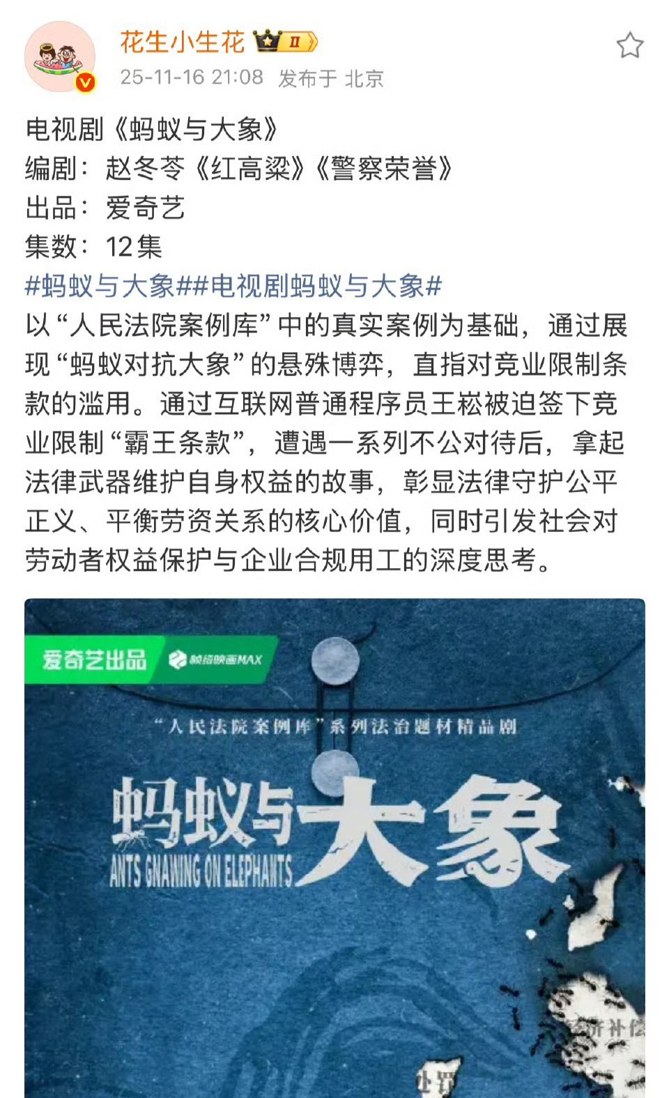 12集电视剧《蚂蚁与大象》,讲互联网程序员竞业性质的这个制作成本花不了多少钱,但感觉故事容易单薄