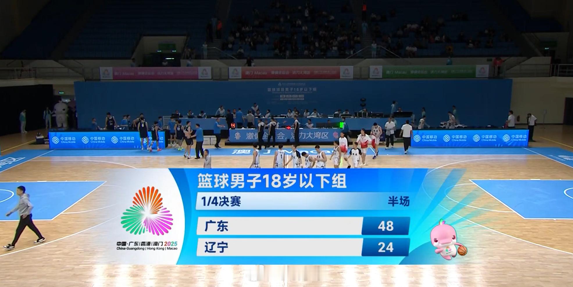 全运会U18男篮淘汰赛,上半场比赛结束,广东U18男篮以48比24领先辽宁U18男篮24分。