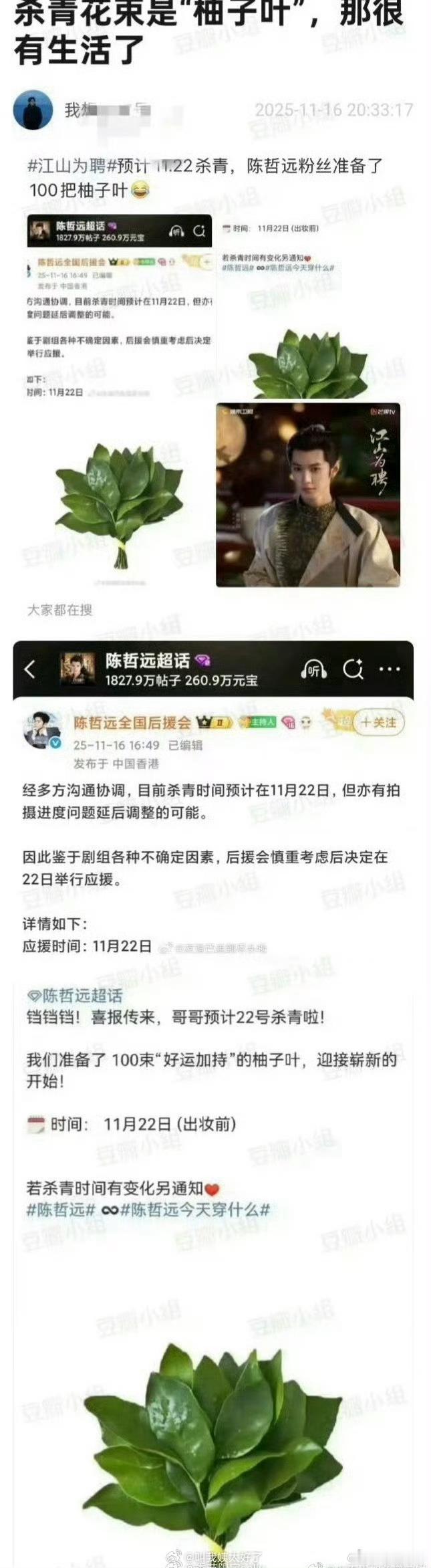 陈哲远粉丝给陈哲远《江山为聘》的杀青礼物是柚子叶哈哈哈哈哈哈还定了100束“好运加持”的柚子叶
