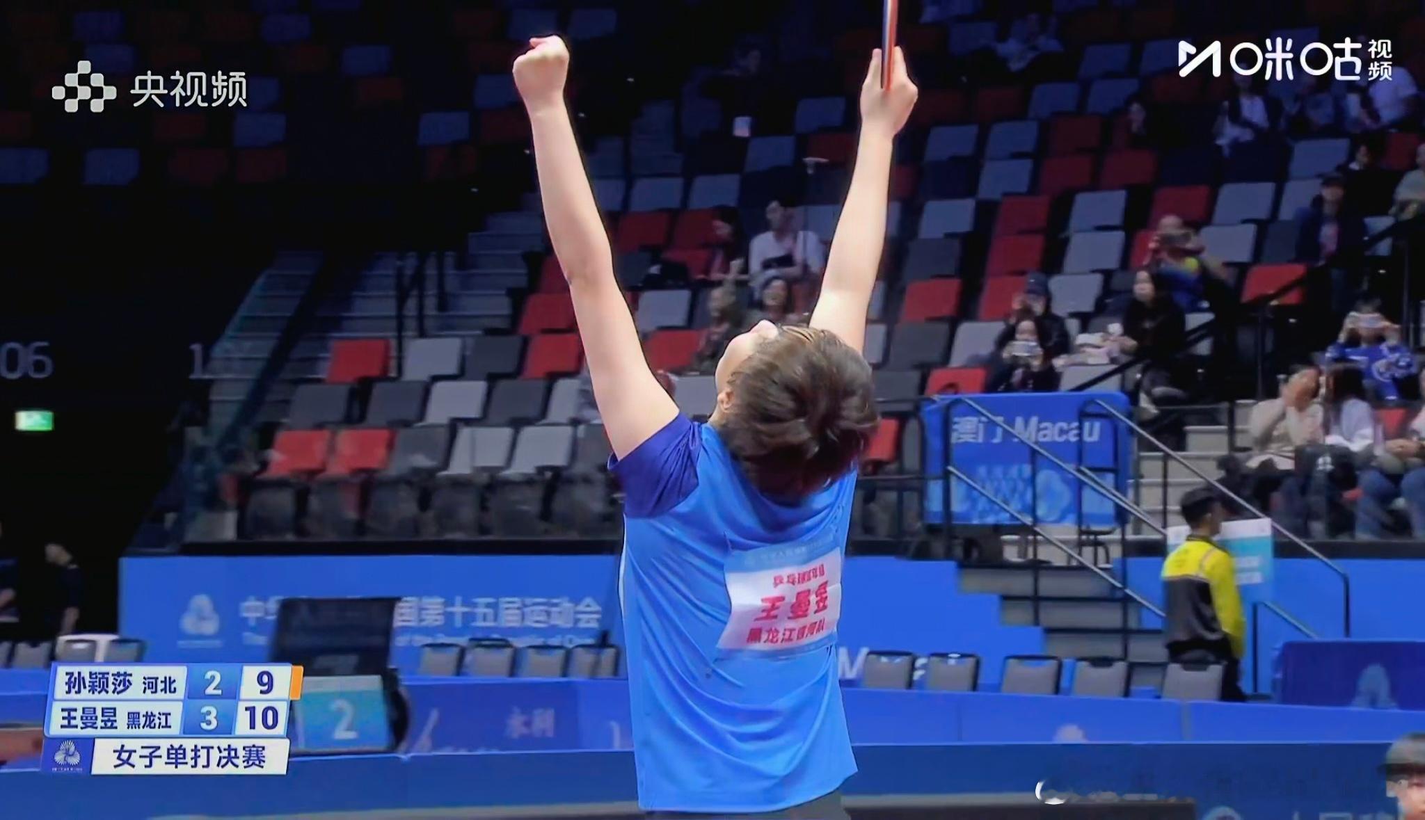 王曼昱!卫冕全运会乒乓球女单冠军🏆刚刚围观了一下女单决赛,孙颖莎和王曼昱这比赛刺激啊,4-2的比分,第五局和第六局绝顶了,尤其是第五局出现金牌点时候孙颖莎挽救的那波赛点;第六局王曼昱大比分落后情况下打回来了,没让比赛拖进第七局……