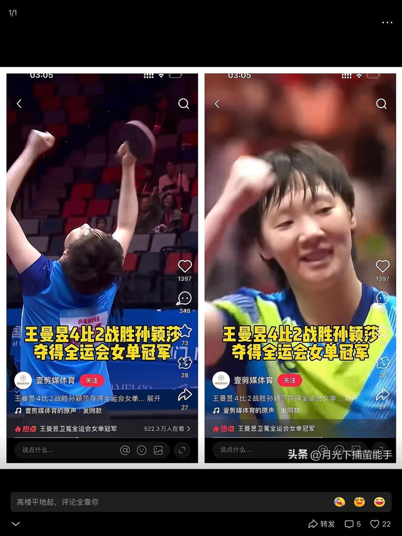 王曼昱夺冠,教练们集体哑火。像极了当年王丽萍的竞走。人赢了,一同庆祝的人不在。闹不闹鬼你说? 假如你是鳗鱼,你作何感想?还有那位带耳塞,降心率的运动员。她∵不悲凉吗?还不能直说。现场干扰太多。喜欢可以表达,发疯一样的表达确实对运动员有影响。还有喝倒彩的,太不讲武德了,小心马保国来给你五连鞭。 都说张继科在角落里,叹了口气。 造星逻辑不可取,竞技体育谁牛谁上。球迷看的是现场的发挥,厮杀。谁都不让谁,这才是对对方最大的尊重。外力的参与,不应该。 王曼昱赢了,你能点个赞吗?我先来。谢谢