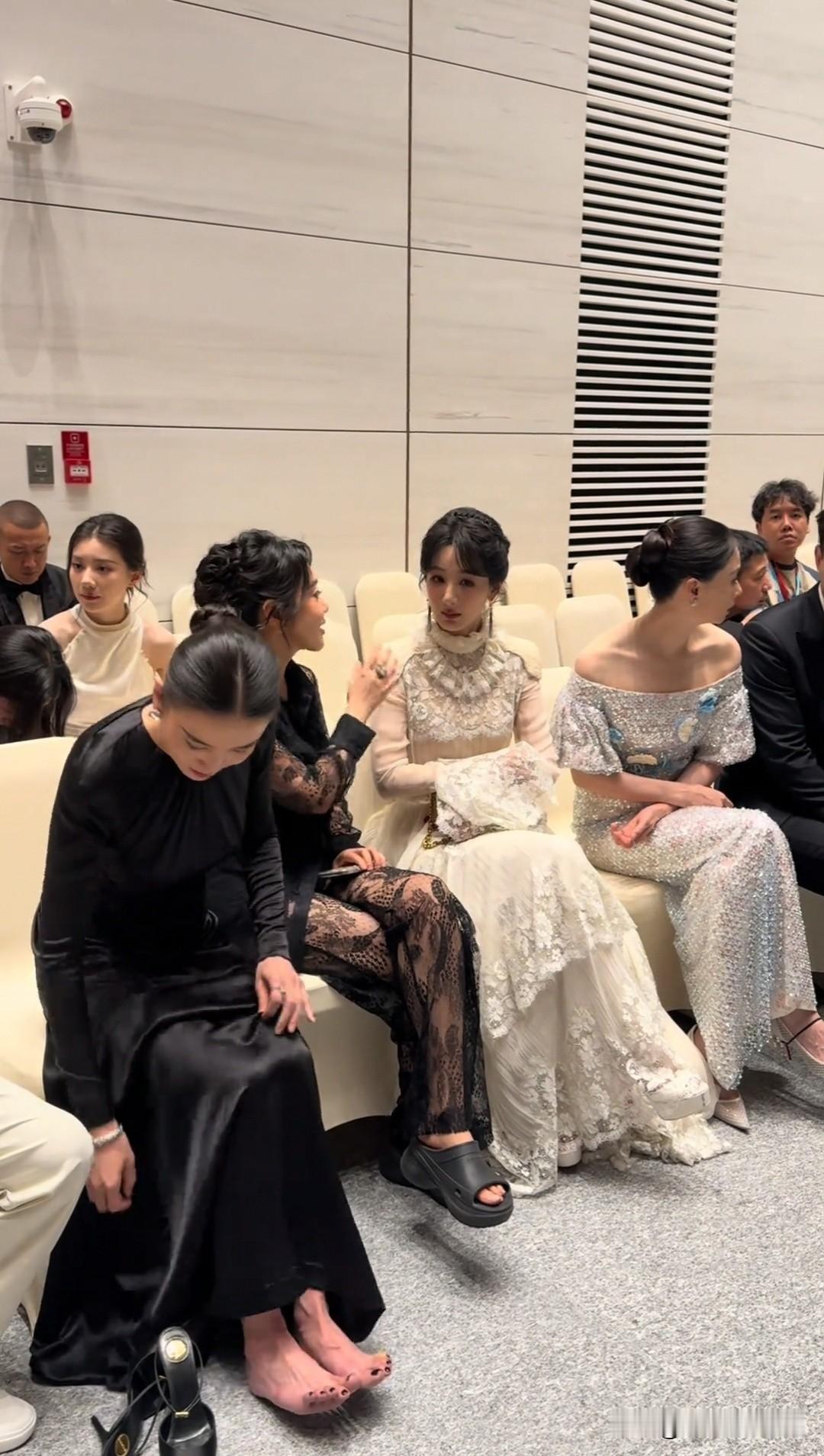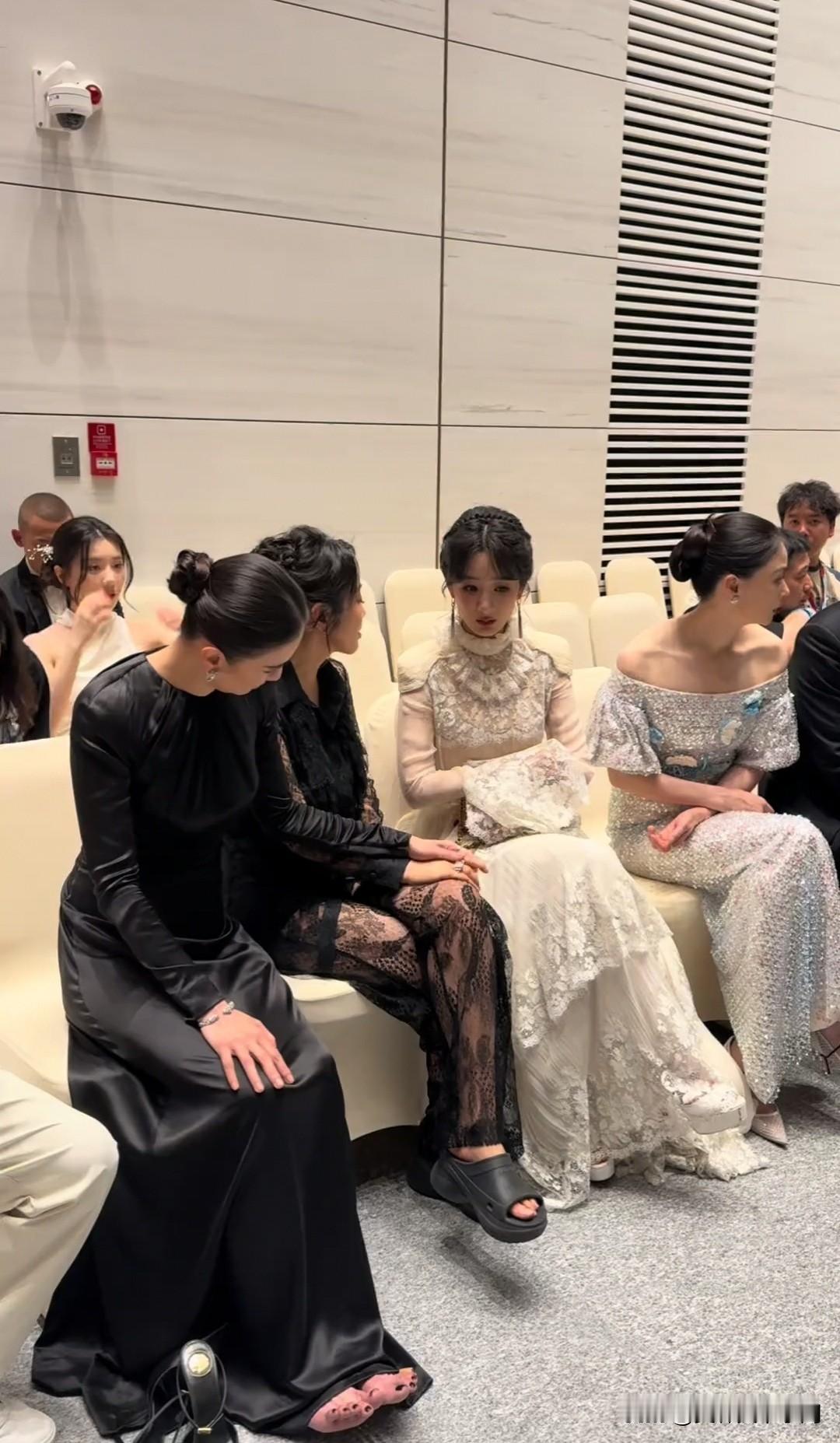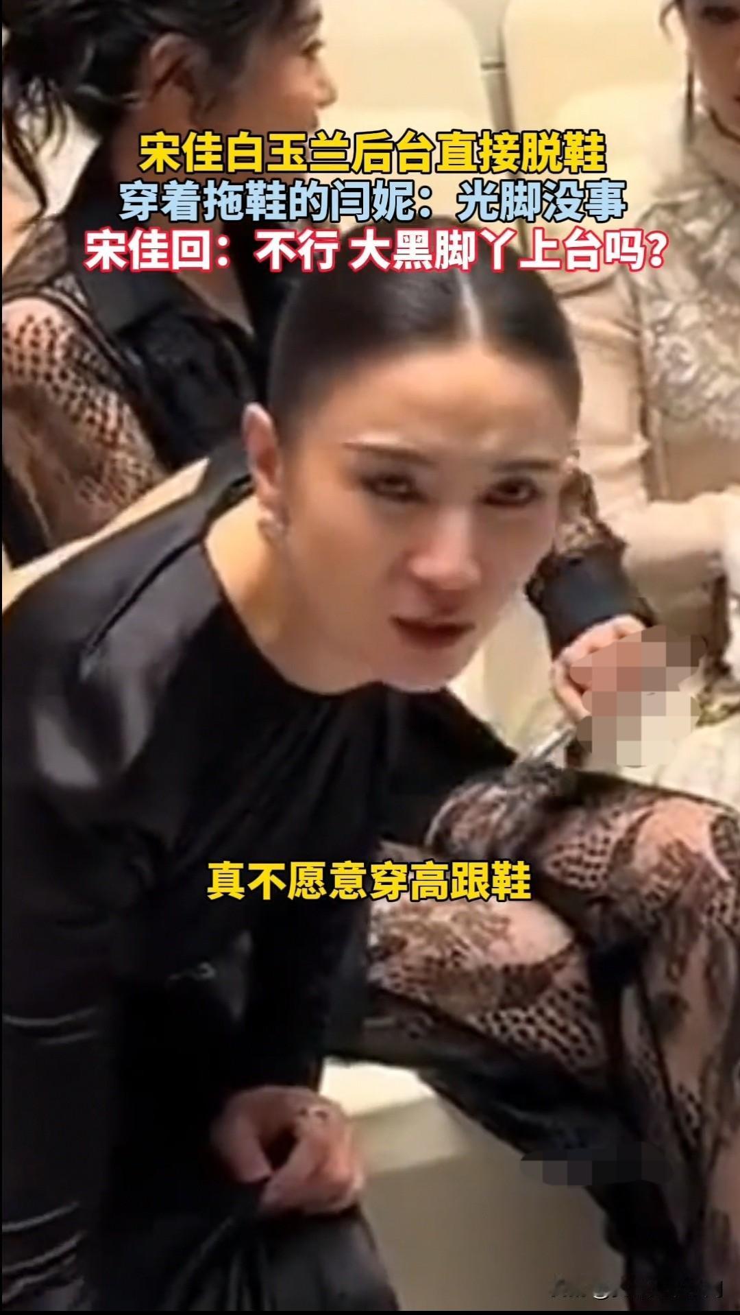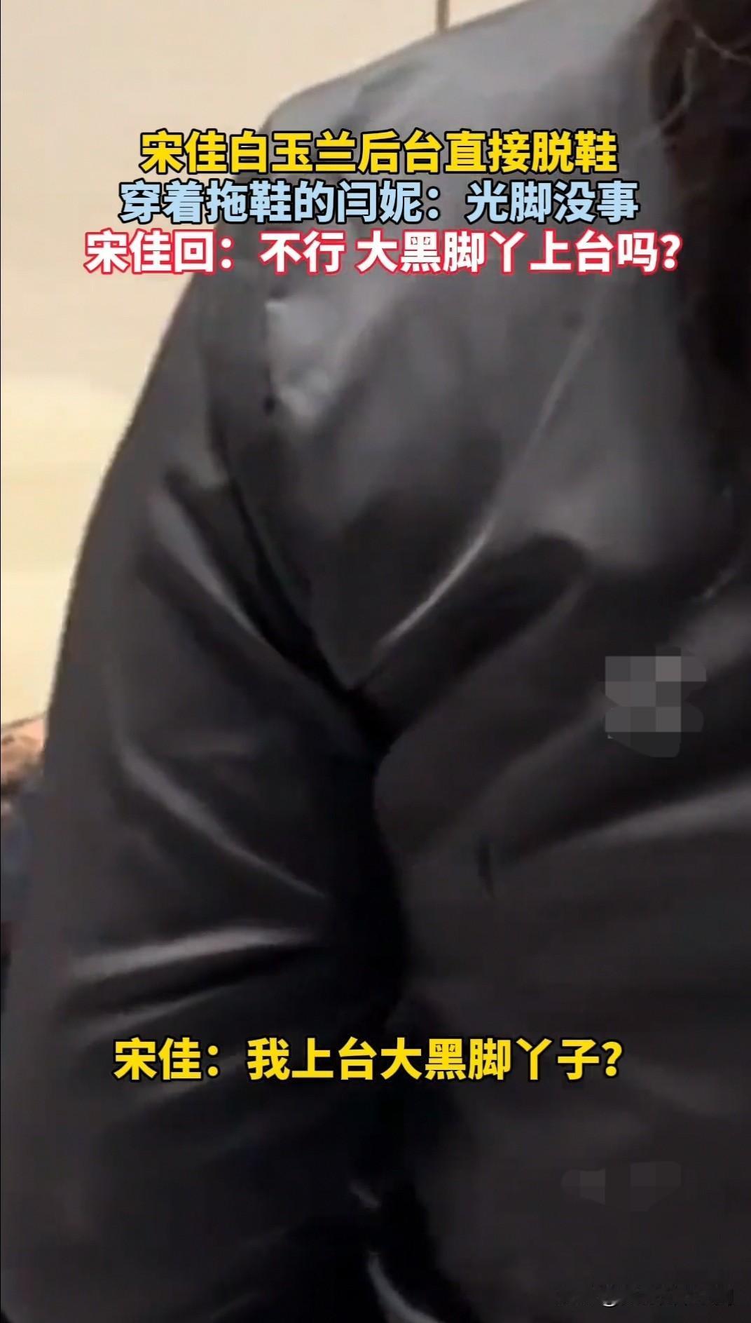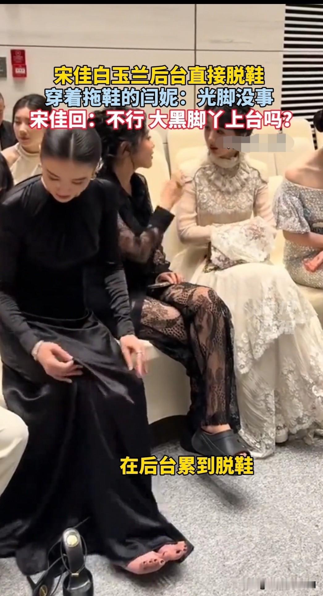 宋佳累到脱鞋,闫妮穿拖鞋,这姐俩的松弛感真是没谁了[呲牙][呲牙][呲牙]“现在离上台还早呢,里面还远得很。” “没鞋”“那就光脚”“滑! 上台大黑脚丫子”[捂脸][捂脸][捂脸]她们好接地气啊,感觉就像出来吃席等着开饭闲唠嗑那种松弛感[泣不成声][泣不成声][泣不成声] 闫妮自己穿个大拖鞋就罢了,还试图撺掇宋佳光着脚[泪奔][泪奔][泪奔]闫妮“光脚没事”,闫妮肯定干过光脚上台的事,我觉得[黑脸][黑脸][黑脸]宋佳非常有气质,美!内外兼修的一流东方女性![比心][比心][比心]