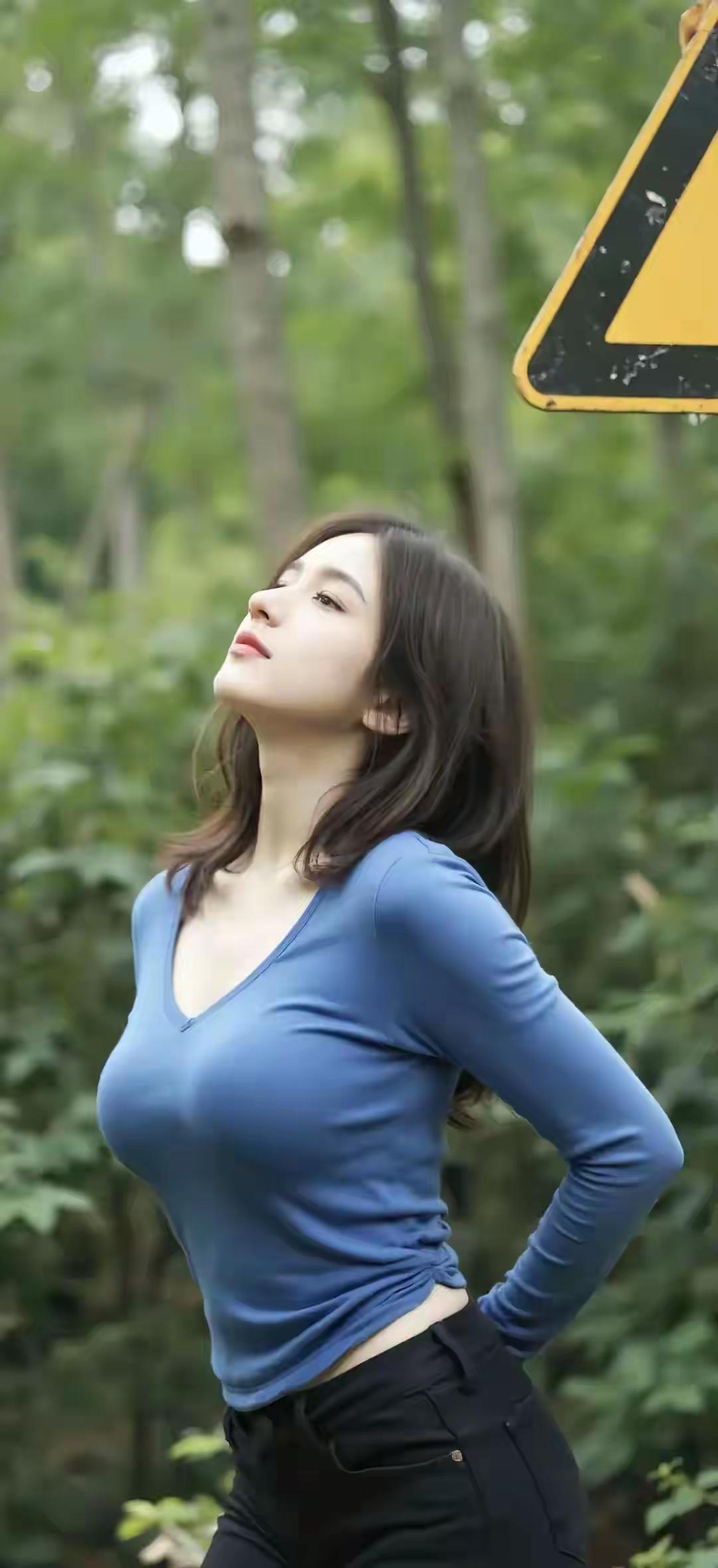 森林中的时尚女孩,蓝衣黑裤,自然清新。
