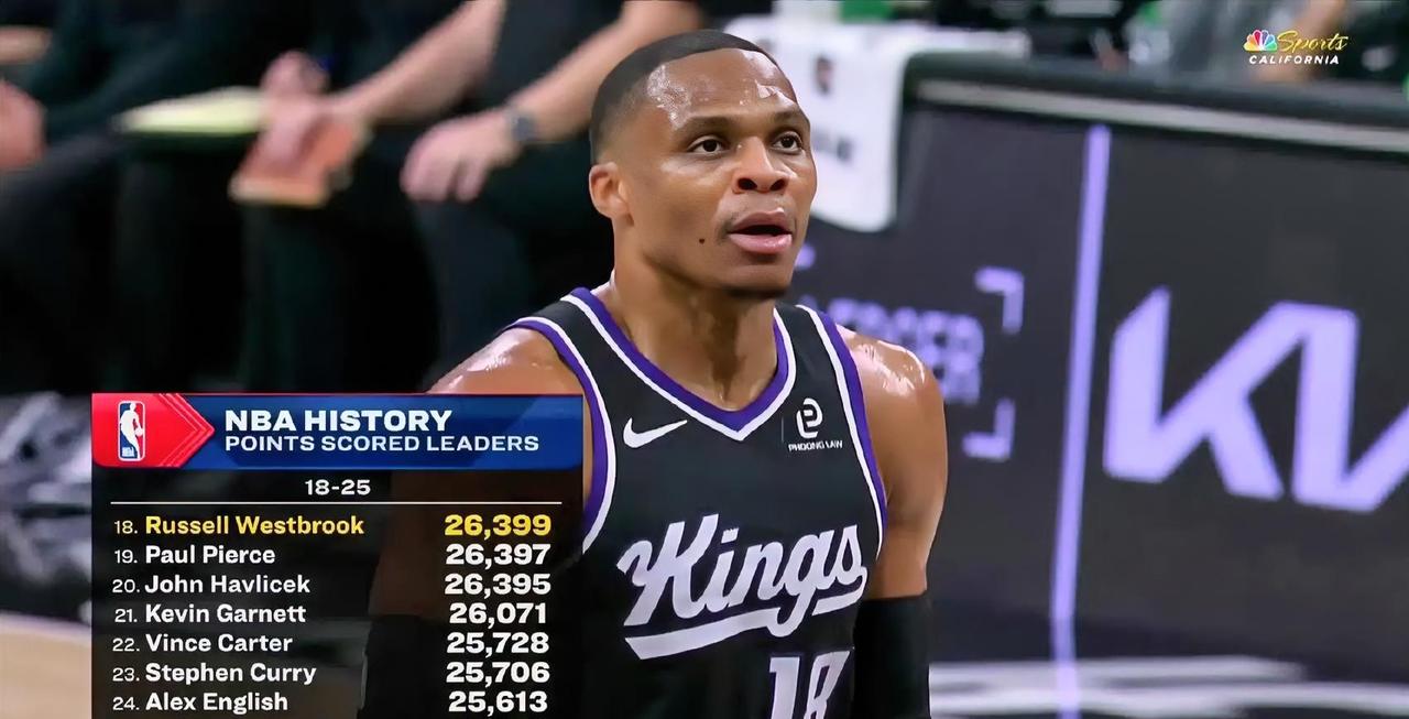 里程悲!威少今日得到14分9板7助2断5失误,投篮11中4,国王不敌马刺遭遇6连败。 凭借本场的14分,威少生涯总得分来到26406分,连续超过哈弗里切克和皮尔斯,升至NBA历史得分榜第18位