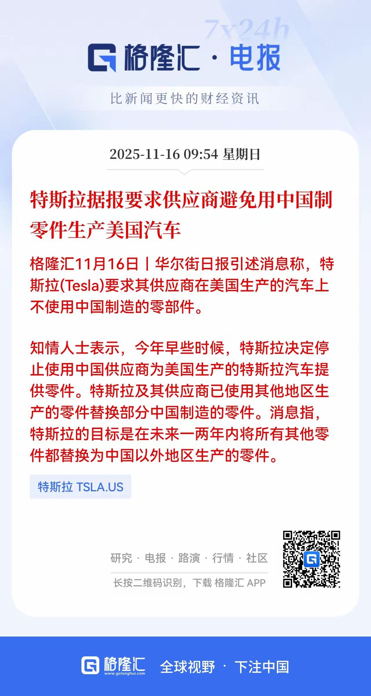 特斯拉竟然也要供应商替换中国生产的零部件? 格隆汇11月16日报道说,特斯拉现在明确要求,其在美国生产的汽车,不能使用中国制造的零部件! 这个消息值得注意的地方是,特斯拉要求的是在美国生产的汽车不能使用中国制造的零部件,因此这个要求对于特斯拉的上海工厂不会有什么影响,毕竟,特斯拉的上海工厂使用的零部件其国产化率已经突破了95%,若是真的不使用这些零部件,那么整个生产活动就要立刻崩溃。 当然,这件事情还是值得注意,格隆汇报道说,特斯拉其实今年早些时候,就已经开始在中国以外的工厂,开启这个零部件去中国化的过程了,现在已经取得不小的成果,估计在未来一两年内,所有其他零部件都会替换为中国以外地区生产的零件。 联想到早些时候,通用也正式要求数千家供应商清除供应链中的中国零部件,由此就可以看出,欧美的这些汽车企业,实际上现在正在以一种稳定的速度,加快了在供应链上的脱钩进程。 他们能够做到这一点,倒也并不令人意外,虽然现在欧美的制造业已经有所衰落,但是在汽车领域依旧具有强大实力,因此想要不使用中国制造的零部件,难度并没有那么大。 毫无疑问,这个听起来,会让人有一些忧虑,毕竟这个脱钩进程加快,肯定会对我们产生一定影响,但笔者认为,实际上,这个其实也不会真的有多大负面影响。 首先,是国产汽车行业,已经崛起!现在,随着我们的新能源电动车崛起,国产汽车行业实际上已经进入到了一个狂飙突进的大发展时代,我们自己国产的汽车,使用的零部件,自然也是我们自己的,就算是欧美这些汽车厂商,真的不使用我们的汽车零部件了,国产汽车也能很快填补这个空白。 其次,是欧美汽车产业链,就算是真的想要脱钩,在一些关键领域,也根本无法做到,比如说稀土,汽车制造也是非常需要稀土的,堪称汽车的“关键性能”材料,而我们在稀土行业,有着绝对的统治力,欧美汽车企业根本离不开。 最后,也最重要的是,我们是全球最大的汽车市场之一!欧美汽车企业,也是想要在我们这里发展得,无论是美国德国,还是日本韩国等国家,他们的汽车企业实际上都在加大对我们的投资,在我们这里建厂,生产汽车,只要是在我们这里建厂生产汽车的,自然会优先使用我们国产的汽车零配件,否则,他们也就不用来了! 所以,从长远来看,特斯拉、通用这种所谓的“脱钩”,对我们其实没有太大影响,不用过多忧虑。 而且,与此相反的是,我们在汽车零配件领域的影响力,实际上还是不断增强的,以前汽车零配件领域,我们还是落后欧美的,比如说德国博世集团,就牢牢占据全球最大汽车零配件企业榜首,但现在,随着我们自己国产汽车行业的发展,我们自己的汽车零配件,已经在飞速崛起,开始挑战这些国际巨头的那看似不可撼动的地位!