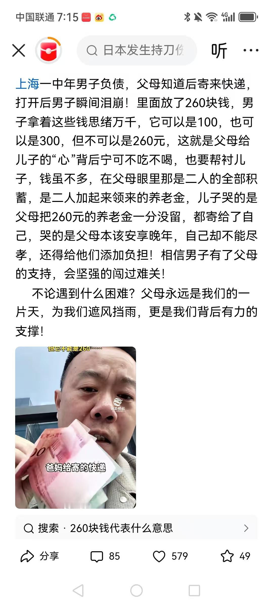 上海一中年男子负债,父母知道后寄来快递,里面放了260块钱。可怜天下父母心,有父母的孩子永远都是幸福的,有父母家就在,没有了父母人生只剩下归途! 人世间的爱都是有条件的,唯有父母的爱最无私,没有任何附加条件。 养育之恩,不求回报,子孙们过得怎么样才是父母最操心的结,可怜天下父母心啊! 儿行干里母担忧,可怜天下父母心!这就是中国的父母,自己宁愿挨饿受累,也要尽自己力所能及的微薄收入帮儿子。 最爱你的是父母,从十月怀胎到子女婚嫁都无私付出。老了还操心第三代,苦! 父母养育之恩,从不求回报,孩子们们过得怎父母挂心上,可怜天下父母心啊! 两个人的养老金。一个人每月一百三十元,加起来两百六十元钱,心寒,老人年龄大了还顾孩子们,为老人家点赞。