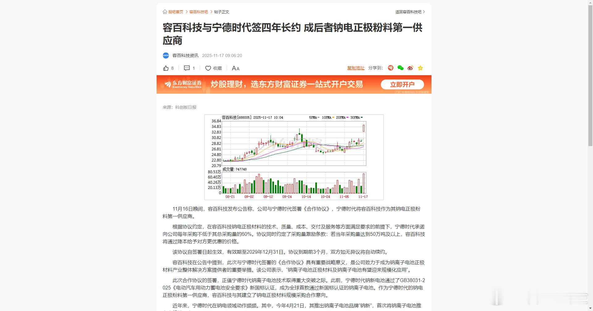 签个合同,怎么反差这么大的,一个20CM涨停,一个........,容百科技与宁德时代签四年长约 成后者钠电正极粉料第一供应商.