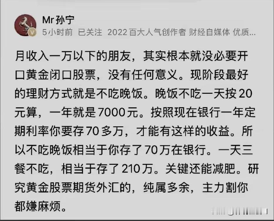 11月13日,财经自媒体、优质财经领域创作者@Mr孙宁说: 收入一万以下的朋友,现阶段最好的理财方式就是不吃晚饭,如果每顿晚餐按20元算,一年就是7000元。不吃晚饭的收益,按照现在银行一年定期利率来计算,等于你有70万的定期存款。 万万想不到啊,财经自媒体的优质创作者竟然这样悲观!为了理财能赚钱,竟然劝别人少吃一顿晚餐!其实,假如真的以这种节俭的方式理财,劝别人少吃一顿饭,不如劝别人戒烟。 因为,一顿晚餐不一定能花20元,可是,一般人一天抽一盒普通烟,真的需要20元,而且,抽烟有害健康,不抽烟了,也许还会省掉去医院的钱。人是铁,饭是钢,一顿不吃饿得慌。所以,如果不是为了减肥,不赞成以不吃晚饭为代价,达到理财这样的目的。