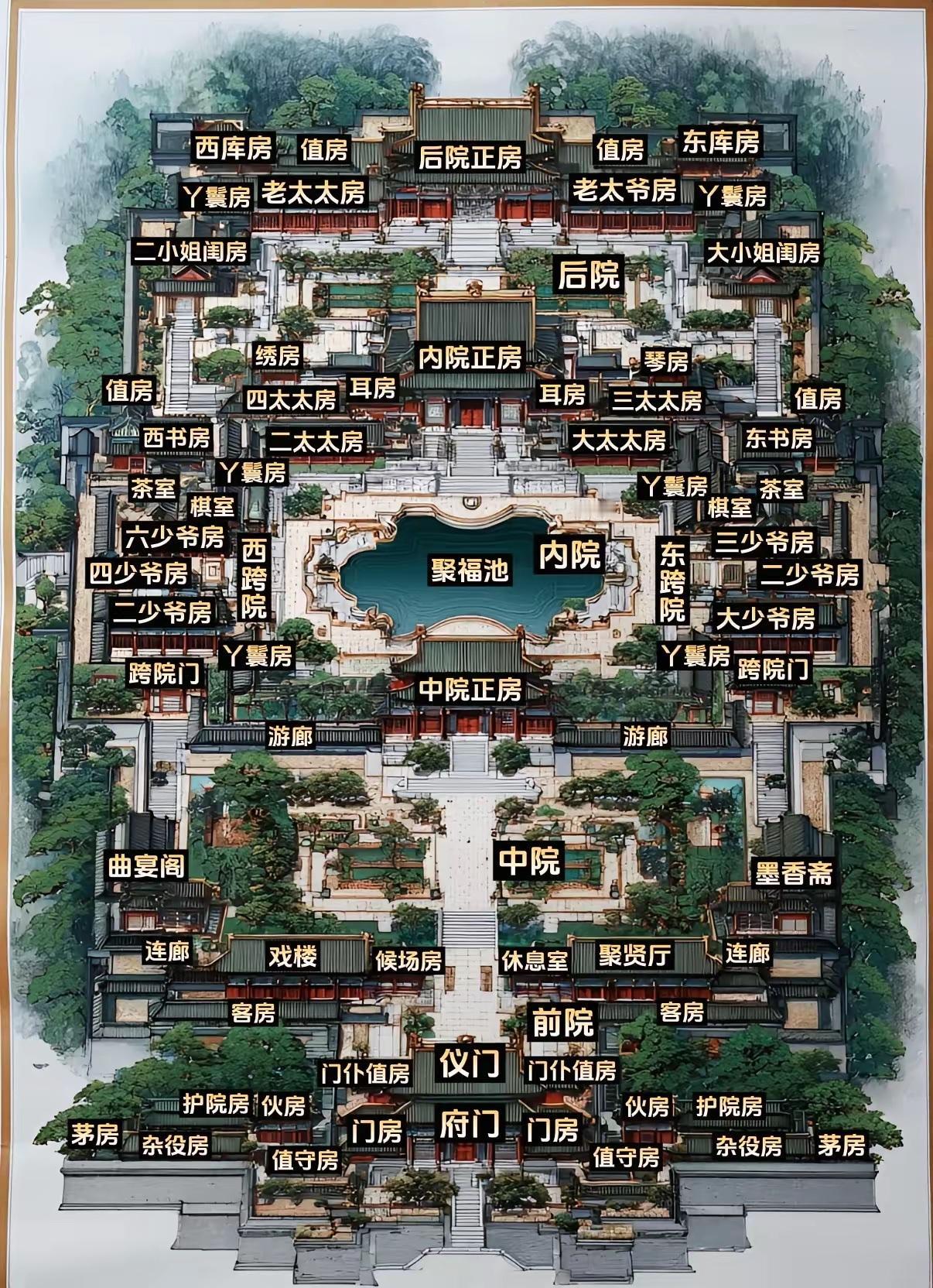 中国古代典型的大户人家住宅的布局,可以看出民族性格。层层围护,堡垒心态。古代的大户人家其实是另类的微小封建领主。里面的丫鬟、佣人、长工就是依附于大户人家生存的社会形态。人类历史上从未有过真正的平等和自由独立。也许星际时代开启后,资源无限,人类或许有那样走进真正自由平等时代的机会。