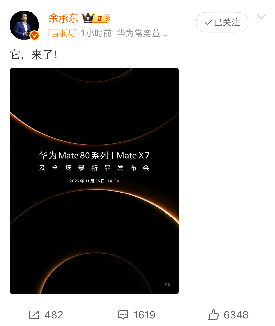 华为Mate80系列今天中午12:08开启预订高清外观照来了,一个金色,一个紫色