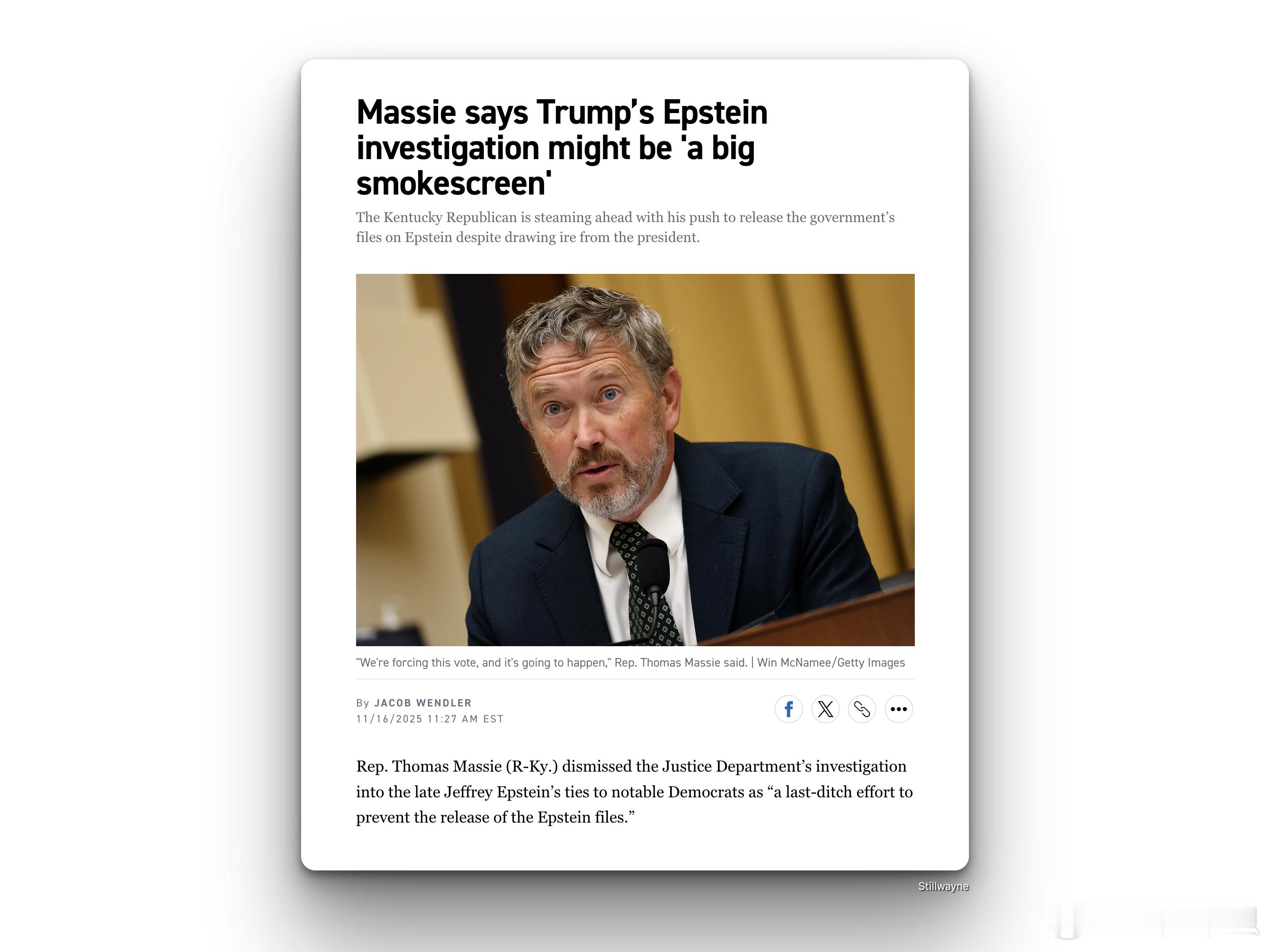共和党众议员托马斯·马西称特朗普要调查民主党与爱泼斯坦的关系是“阻止爱泼斯坦档案公开的垂死挣扎”。马西周日在ABC的“本周”节目中告诉乔纳森·卡尔:“如果他们正在某些领域进行调查,那么这些文件就不能公开,”...“所以,这些调查可能是一个巨大的烟幕弹,目的是通过展开一系列调查来阻止爱泼斯坦文件的公开,这是他们最后的挣扎。”