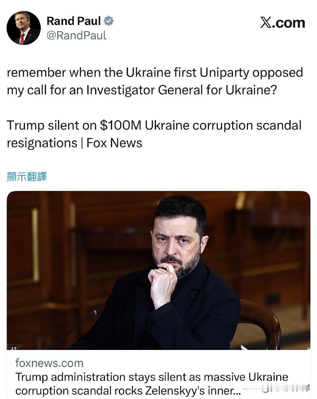川普对泽圣盟友涉嫌贪污保持沉默,Rand Paul发文指出这一点。 “还记得当初“乌克兰第一”的联合党(Uniparty)是怎么反对我设立乌克兰监察长的呼吁的吗? 如今特朗普对涉及 1 亿美元的乌克兰腐败丑闻——导致泽连斯基核心圈多人辞职——却保持沉默。”