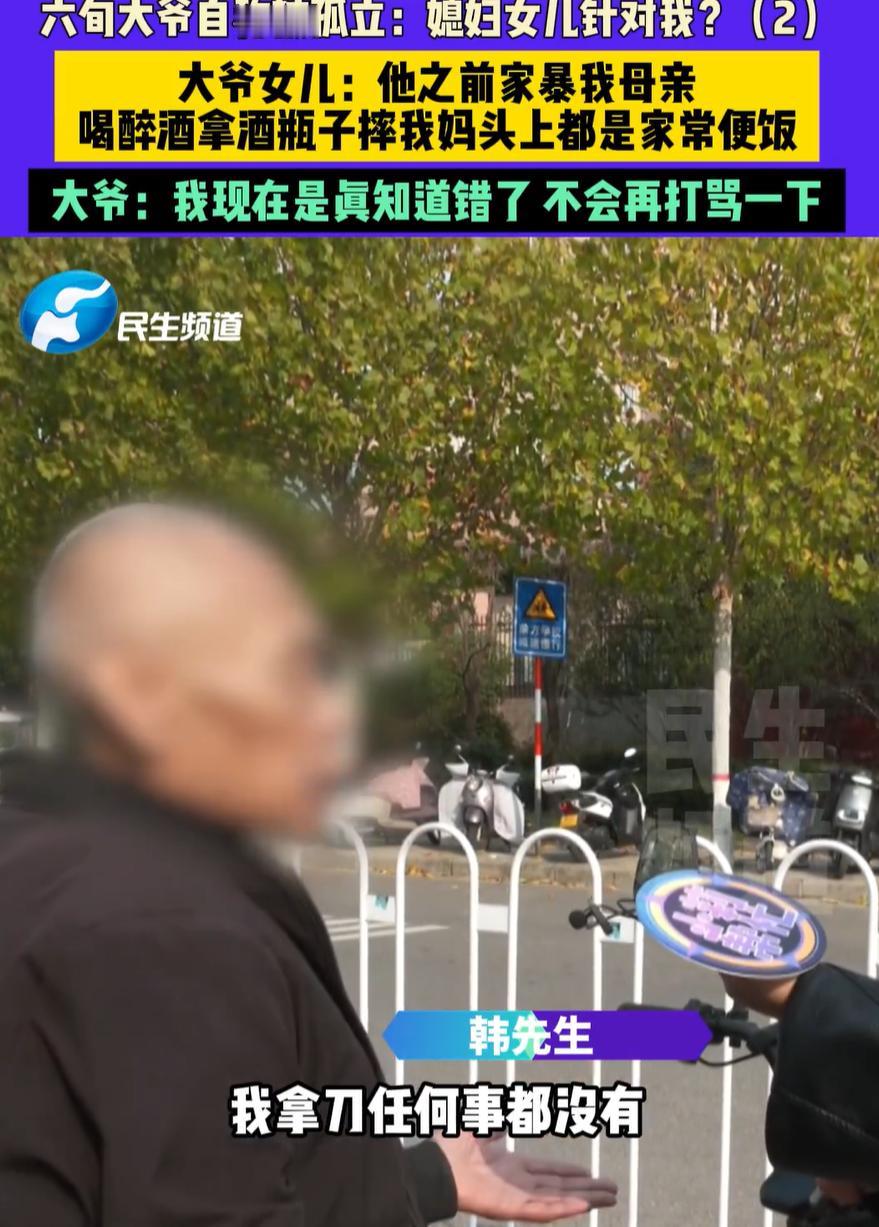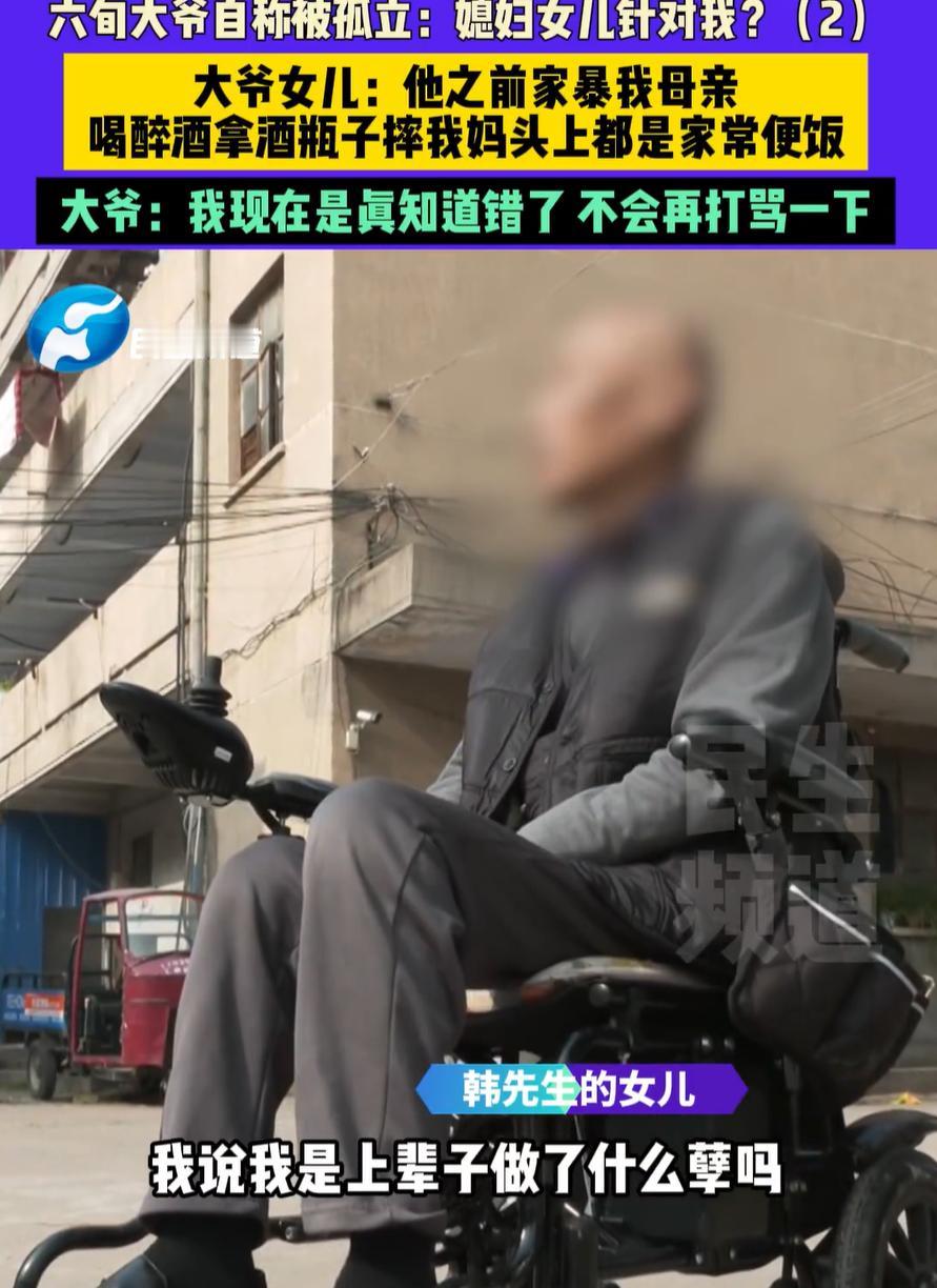 反转了!河南许昌,男子因腿脚不方便被家人照顾,一次和妻子拌嘴后,对方竟然打了他两巴掌,而且还把他送到养老院,男子不知道自己哪里对不起他们,就找到媒体反映,结果记者一问才知道,男子年轻时经常家暴妻子,妻女早就对他失望了 韩先生介绍,自己因身体原因离不开轮椅,去年与妻子争吵后,竟被妻子当众扇了耳光,随后被家人送进养老院。他每月2200元退休金,妻子只给他600元,后来更减至300元 在他看来,自己越想越觉得自己被抛弃。他找到媒体时,整个状态就是一个被家人遗忘的老人,对着镜头说想要个机会,想回这个家 记者一开始也愣住,可找到韩先生的女儿后,才发现事情另有起源 女儿说,从她记事起,父亲就经常家暴母亲。酒瓶子砸头、吼叫、威胁,全是日常。最后一次见父亲时,对方拿着刀往她面前走,她彻底凉透,那一刻父女之间的那点亲情算是断了 这件事让人唏嘘。韩先生现在想弥补,是真心还是无奈不得而知。他说自己永远不会再动手,愿意改,希望妻子和女儿再给个机会。站在旁观者角度,很难简单替他下判断,只能说每个人的选择都有背后的重量 说实话,很多关系不是一天垮的,年轻时的行为,看似过去就过去了,到了老年却会以另一种方式回来。过去的伤口不是随着时间消失,而是随着时间变硬,变成家人心里一块无法再碰的地方 站在妻子和女儿的位置,她们选择远离,是在给自己留活路,也是在保护多年劳累的身心。站在韩先生的位置,他终于感觉到孤独和失去,可惜来得太晚 希望韩先生是真的想改,也希望妻子和女儿能过上心安的日子。不是一定要重聚,而是能忘掉以前那些不愉快的经历 男子家暴妻子多年 年老后道歉求原谅