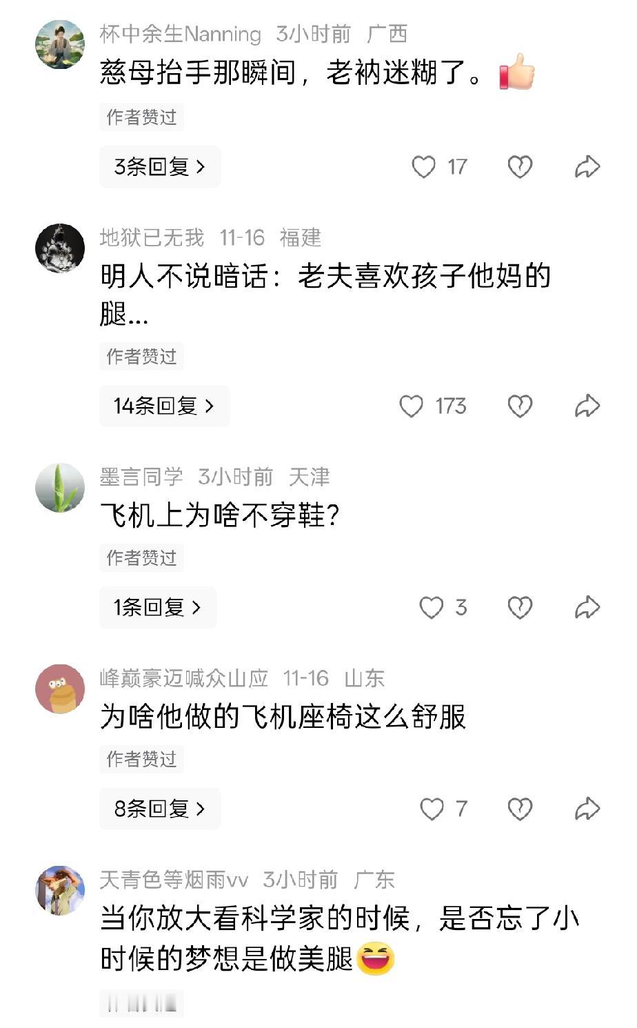 人家只是说了一个孩子喜欢吃飞机餐! 结果网友的评论一致都在说人家的腿…… 你看,这就是人的本性,只能看到自己想看到的,而忽略了事件本质。 其实说到孩子喜欢吃飞机餐这件事,算了……孩子没吃过,不知道该如何说。 还是说说这个腿,你看这个腿,它又长又白,这叉裙一开,谁看了不迷糊。 所以说还是女性好,吸引人的地方多,整体身材,腿,胸,脸,头发,都可以单独拿出来欣赏。 但男的不行,露大腿没人看,即使有腹肌还是在衣服里面,就除了一个脸了……