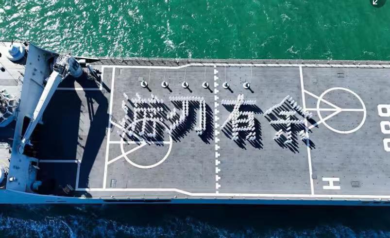 我海军综合登陆舰“长白山舰”上摆出“从从容容”“游刃有余”字样! 海军989编队星期六从青岛军港起航,开始执行远海综合实习任务。航渡期间,来自海军工程大学和海军航空大学的军校学员,在综合登陆舰“长白山舰”的飞行甲板上,摆出“从从容容”和“游刃有余”字样。