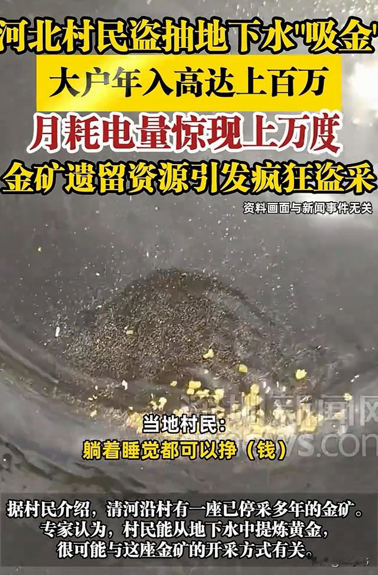 “躺着都能赚钱!”河北一村子的村民在自家院子里打深井,抽地下水来炼黄金,一年能用九万多度电,年收入能达到一百多万! 怎么操作的呢? 简单说,就是往地下打八九十米甚至一百多米的深井,用大功率水泵把水抽上来,让水流过装满活性炭的大铁桶。 地下水里含有的金元素就会被活性炭吸附,剩下的水直接排进河里。 每隔一两个月,把吸饱金的活性炭取出来烧炼,就能提出黄金。 这可不是小打小闹。 有户村民2024年全年用电量竟然达到9.6万度,电费七万七千多元,单月最高用电量超过1万度——这相当于普通家庭几十年的用电量。 为啥这么耗电? 因为水泵要24小时不停运转,每小时就能抽15吨水,三个月下来能抽走3万吨地下水。 这么干赚钱吗?相当赚! 村民算过账,抽水三个月总成本约2万元,而每批活性炭最少能炼出百八十克黄金。 按现在金价每克近千元算,刨除成本净赚四五万,村里的“大户”一年纯利能超百万。 难怪有网友调侃:“这哪是抽水,是抽钞票啊!” 也有网友担忧:“这样抽水,迟早把子孙后代的水都抽干了。” 其实这事跟村里一座停采多年的金矿有关。 这座金矿用“堆浸法”开采,导致含氰化物的药剂溶解了矿石中的金元素,渗入地下水中。 现在村民等于是在“捡漏”,直接把含有金元素的地下水抽上来提炼。 但这样疯狂抽水的弊端也相当明显。 首先就是地下水位严重下降,枯水期全村50多户吃水井干涸,没水喝的村民只能外出运水。 而且抽出的地下水本身含有金元素等重金属,炼金后排入河道可能造成“二次污染”。 普通金元素人体无法吸收,会在体内积累。一时的利益,可能让整村人健康买单。 最重要的是,村民抽水炼金涉嫌违反《水法》《矿产资源法》,可能构成非法采矿罪。 资源属国家所有,不是谁抽到就归谁! 村民盗抽地下水“吸金”年入百万