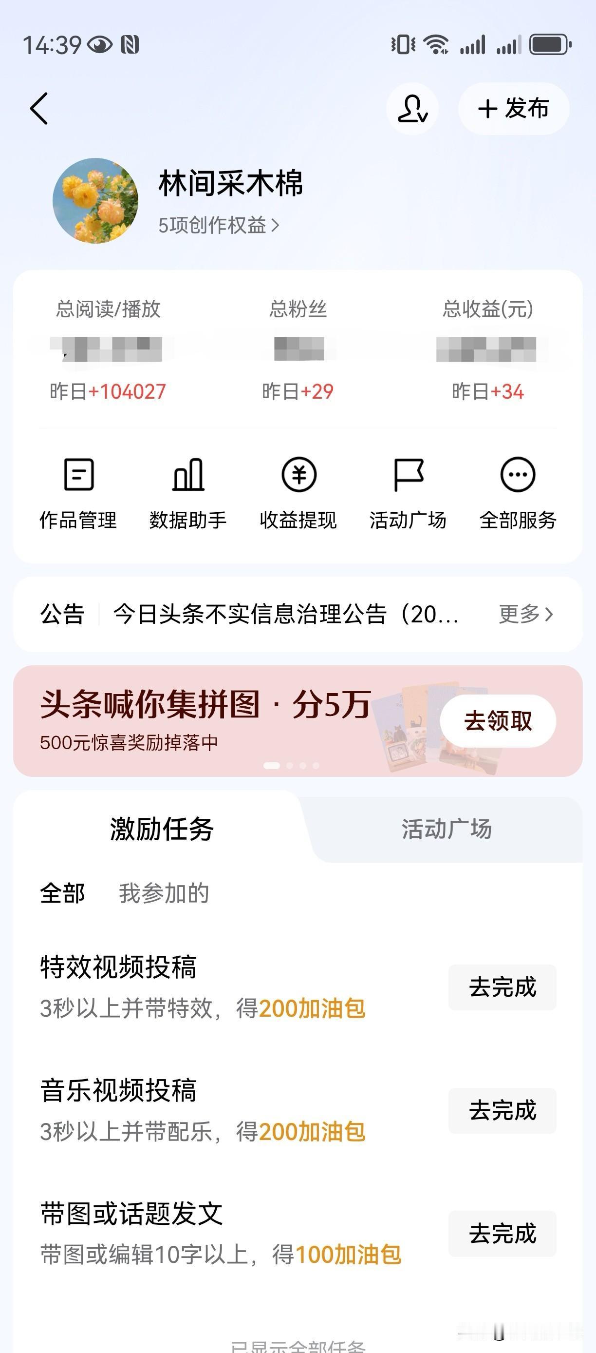 10万+阅读量,34块钱,单价0.32,不是好多人都说单价上升了吗?怎么还是低的这么离谱! 不管如何,每天写点打发打发时间,生活还充实一些,至于收益,有,聊胜于无。每天有个几块钱,够买个菜,吃顿早餐,就很开心了!