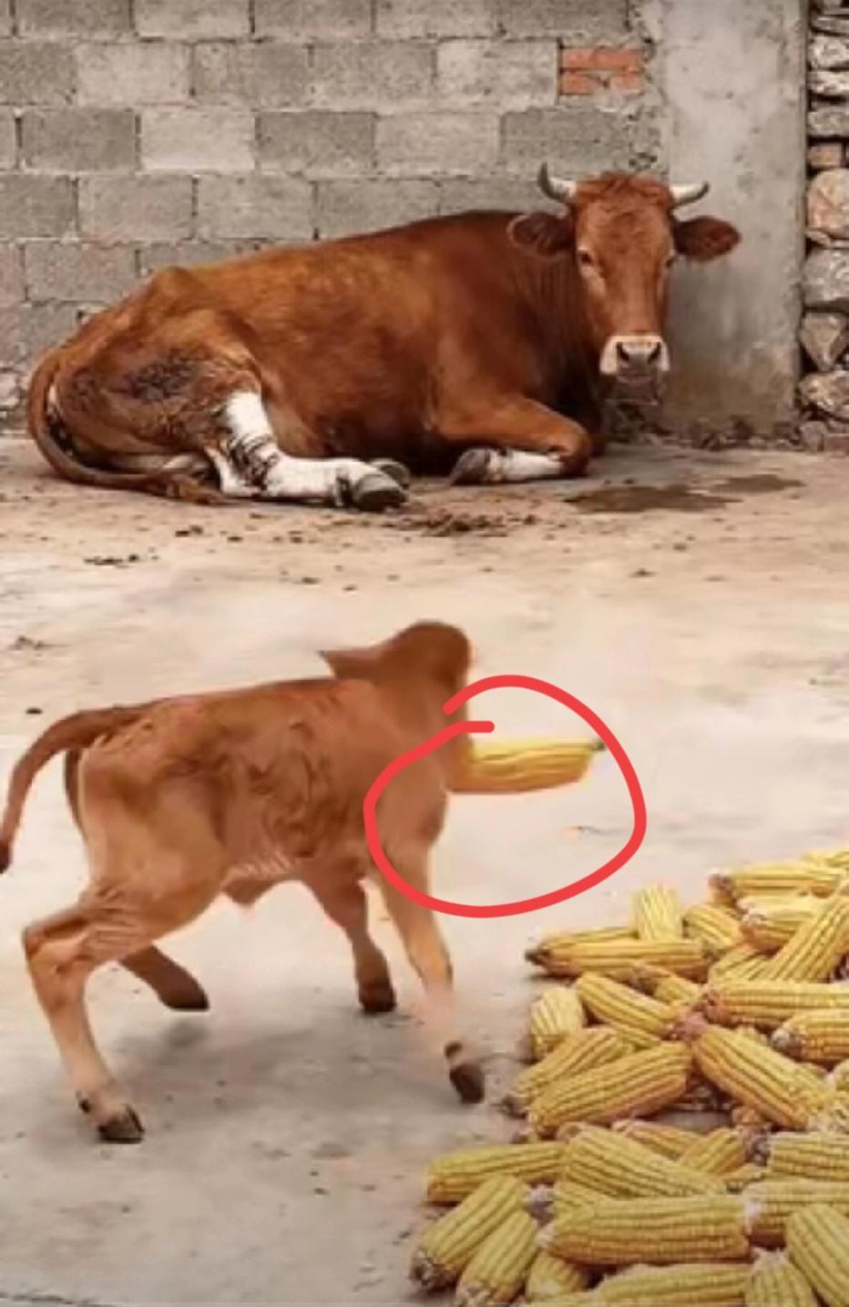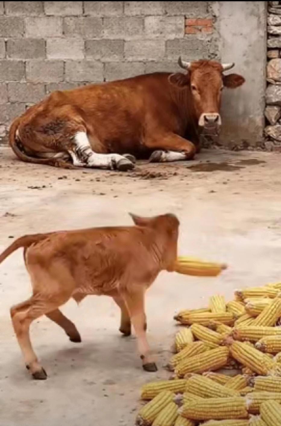 牛妈妈腿受伤了,躺在墙角动弹不了。刚出生几个月的小牛犊跑过去,把玉米棒子叼起来喂给妈妈吃。这一幕看得人好感动。 千万别觉得牛憨憨的就没灵性,其实它们感情细着呢,比不少冷血的都强。这小牛犊才几个月大,自己都还在吃奶学吃东西的阶段,居然能想到妈妈动不了会饿,硬生生用还没长硬的小牙叼着玉米棒,一步一踉跄地凑到妈妈嘴边。 换做别的小动物,可能早自顾自找吃的去了,可这小牛不一样。它肯定是看到妈妈躺着不动,眼神里都是着急,才想起去叼食物。你想想,牛又没人教它要孝顺,这举动纯粹是刻在骨子里的本能,是天生的母子情深,这种最原始的善意才最打动人。 村里养过牛的老人都知道,牛是记恩情的动物。以前种地全靠牛拉犁,你对它好,给它添点好草料,它干活就格外卖力,还会主动跟着你走,绝不会耍性子。有的牛甚至能记住好几年前的事,就算换了地方,再见到老主人还会凑过去蹭蹭,特别亲热。 更让人感慨的是,牛不光对人有感情,对自己的同伴、家人更是重情重义。听说过吗?牛群里要是有同伴受伤,其他牛会主动围在旁边保护,不让天敌靠近。还有人见过,牛知道自己要被宰杀的时候,会默默流泪,那模样看着就让人心酸。它们虽然不会说话,可喜怒哀乐全写在脸上,心里跟明镜似的。 现在好多人总说人情淡薄,可看看这小牛犊,真该臊得慌。它都知道妈妈养它不容易,关键时刻挺身而出,这份纯粹的孝心,比多少甜言蜜语都管用。万物皆有灵,牛用自己的方式诠释着什么是感恩,什么是亲情。 咱们做人更该如此,父母辛辛苦苦把我们拉扯大,付出的比牛妈妈可多太多了。别等到子欲养而亲不待,才后悔没好好孝顺。平时多关心关心爸妈,哪怕只是端杯热水、说句暖心话,他们也会记在心里。 各位读者你们怎么看?欢迎在评论区讨论。农村
