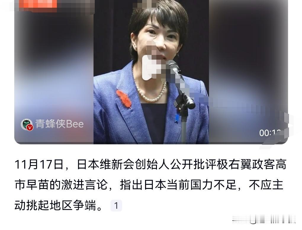 高市早苗呀高市早苗。 你这是何苦?为什么要大言不惭的发布涉台挑衅言论? 这下弄得里外不是人了。 遭到中日有识之士的广泛痛批。 11月17日消息称,日本极右翼也怕了:这点国力何必惹事。 好自为之吧,高市早苗。