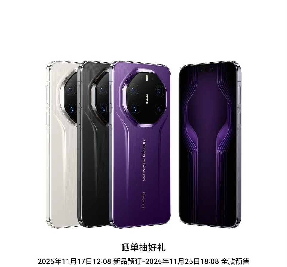 华为Mate80系列今天中午12:08开启预订高清外观照来了,一个金色,一个紫色