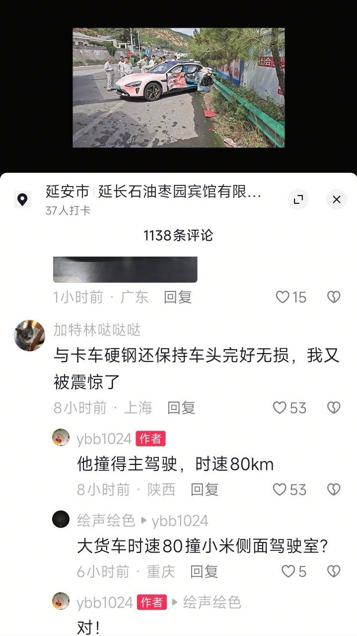 我有很多车,目前开的最多的就是小米因为安全,小命要紧 !这个撞击,一个B柱直接抗住了大卡车车主还能下来拍个抖音 转身立马下单小米yu7max,哈哈哈哈