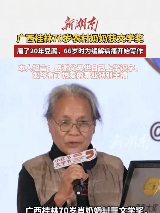 11月15日,广西一位70岁的农村老奶奶因其感人至深的故事获得文学奖。她多年来靠种地、磨豆腐维持生计,直到66岁,为了缓解病痛,她开始拿起笔写作,用文字记录自己的人生历程。她用朴实的笔触展现了农村生活的点滴,也传递出坚韧不拔的精神,成为激励许多人的榜样。这份荣誉不仅是对她个人的肯定,也彰显了坚持与热爱的力量,证明了人生的精彩可以在任何年龄绽放。