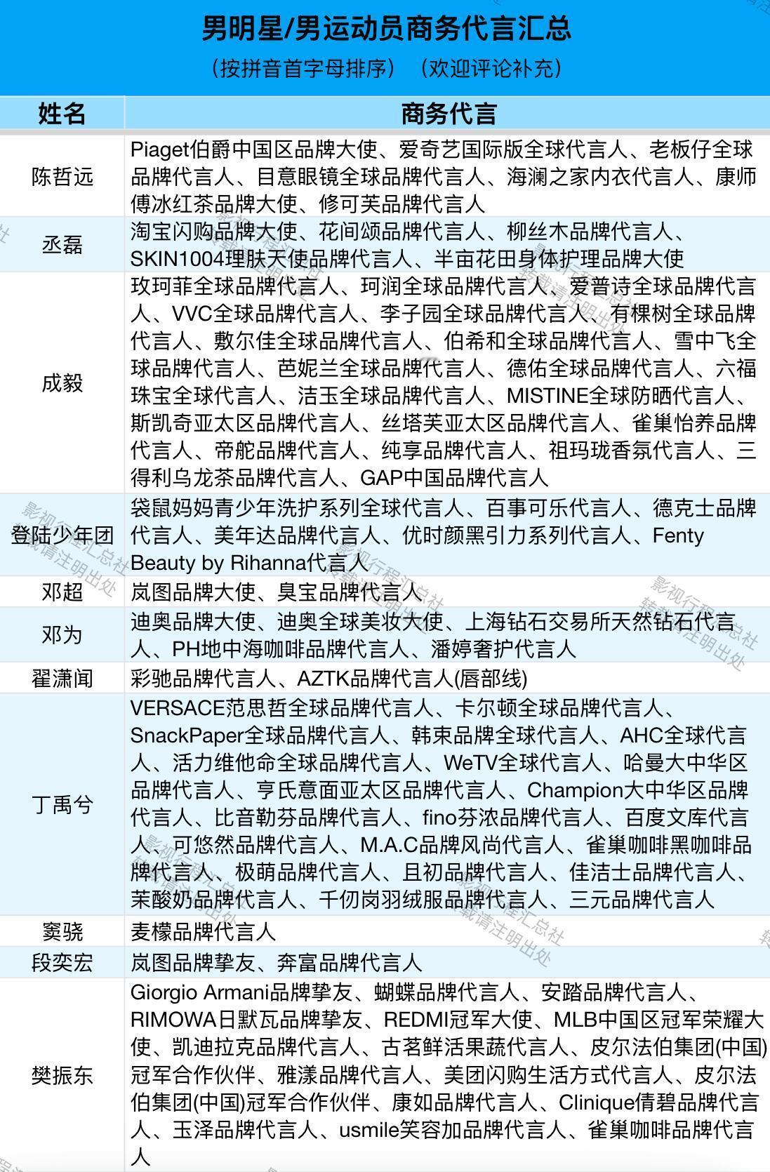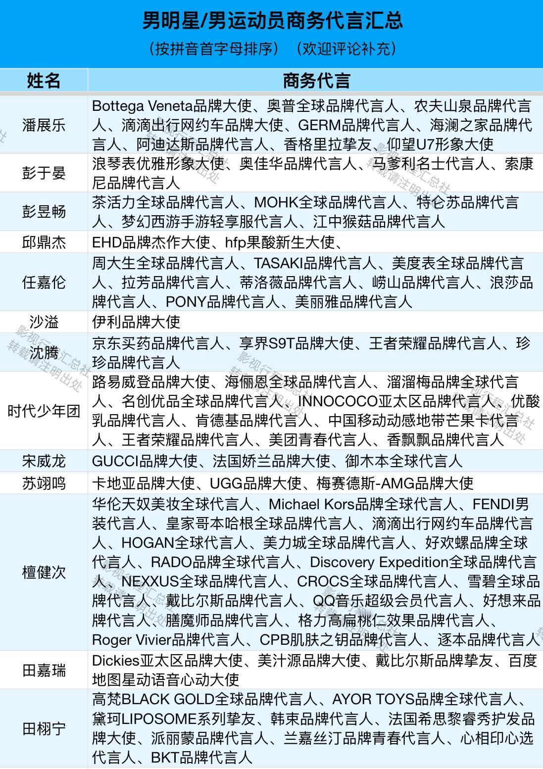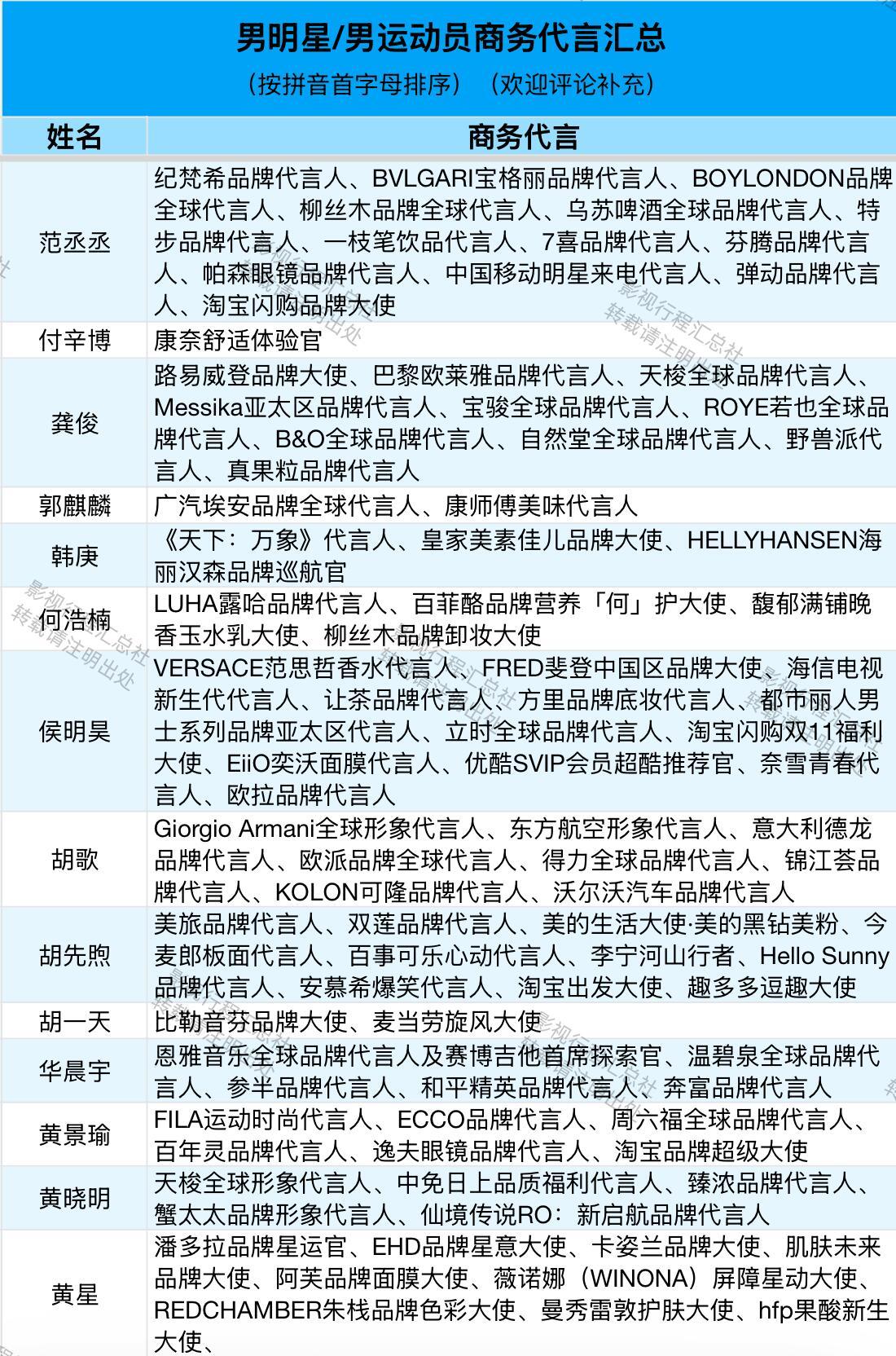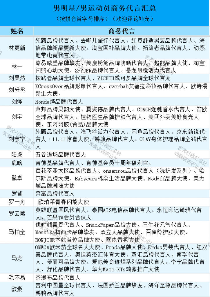 男明星/男运动员商务代言汇总(按拼音首字母排序)阿云嘎、敖瑞鹏、敖子逸、白敬亭、白客、白宇、毕雯珺、蔡徐坤、曹骏、曾舜晞、常华森、陈楚生、陈道明、陈飞宇、陈伟霆、陈鑫海、陈星旭、陈哲远、丞磊、成毅、登陆少年团、邓超、邓为、翟潇闻、丁禹兮、窦骁、段奕宏、樊振东、范丞丞、付辛博、龚俊、郭麒麟、韩庚、何浩楠、侯明昊、胡歌、胡先煦、胡一天、华晨宇、黄景瑜、黄晓明、黄星、黄子弘凡、蒋奇明、靳东、井柏然、雷佳音、李耕耘、李昊、李乃文、李现、李昀锐、梁伟铿、林高远、林更新、林一、刘昊然、刘轩丞、刘烨、刘宇、刘宇宁、陆虎、鹿晗、鹭卓、罗晋、罗一舟、罗云熙、马柏全、马龙、毛不易、欧豪、潘展乐、彭于晏、彭昱畅、邱鼎杰、任嘉伦、沙溢、沈腾、时代少年团、宋威龙、苏翊鸣、檀健次、田嘉瑞、田栩宁、汪顺、王安宇、王昶、王楚钦、王鹤棣、王嘉尔、王俊凯、王琳凯、王天辰、王星越、王阳、王耀庆、王一博、王一珩、王源、王铮亮、王子奇、魏大勋、魏哲鸣、文俊辉、吴磊、肖战、辛云来、徐明浩、徐振轩、许凯、闫桉、颜安、杨和苏、杨烁、杨洋、易烊千玺、于适、余承恩、展轩、张彬彬、张杰、张康乐、张凌赫、张若昀、张晚意、张新成、张艺兴、张云龙、张震、章昊、郑恺、郑业成、周杰伦、周柯宇、周深、周翊然、朱嘉琦、朱亚文、朱一龙、卓沅、梓渝
